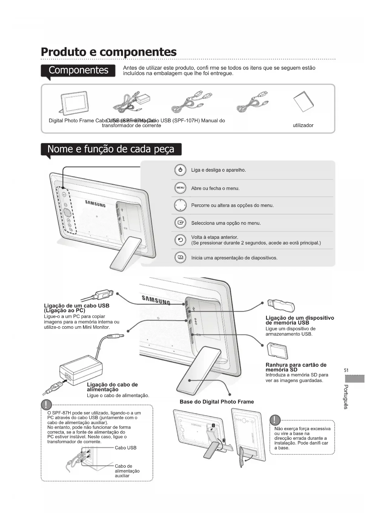 (Ligação ao PC) Ligue-o a um PC para copiar imagens para a memória interna ou utilize-o como um Mini Monitor. Base do Digital Photo Frame Não exerça força excessiva ou vire a base na direcção errada durante a instalação. Pode dani car a base. O SPF-87H pode ser utilizado, ligando-o a um PC através do cabo USB (juntamente com o cabo de alimentação auxiliar).No entanto, pode não funcionar de forma correcta, se a fonte de alimentação do PC estiver instável. Neste caso, ligue o transformador de corrente.Cabo de alimentação auxiliarCabo USB Liga e desliga o aparelho.Abre ou fecha o menu.Percorre ou altera as opções do menu.Selecciona uma opção no menu.Volta à etapa anterior.(Se pressionar durante 2 segundos, acede ao ecrã principal.)Inicia uma apresentação de diapositivos. BN68-01567J.indb 51 2009-07-14 �� 3:48:11Português
