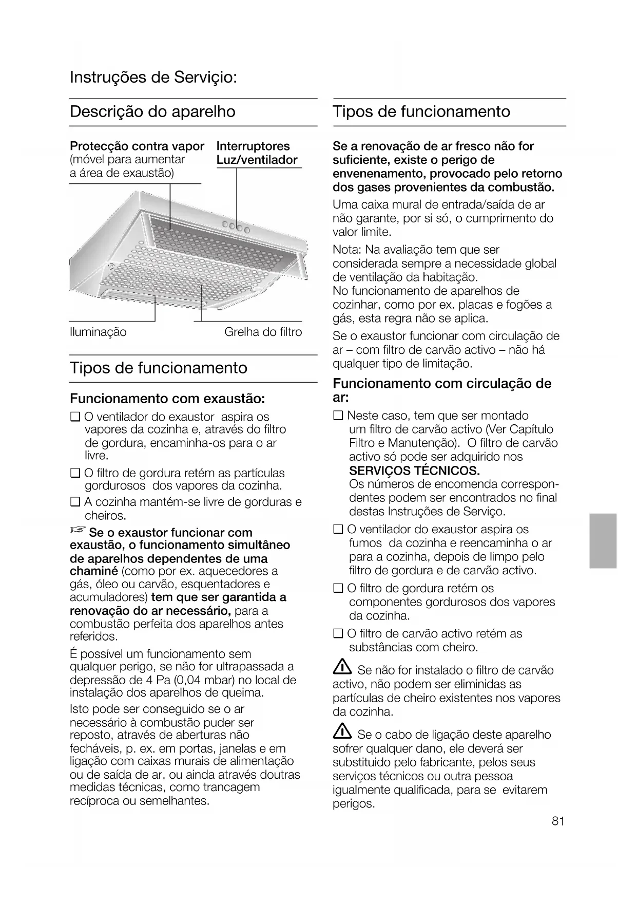 Indicações importantes: ❑ Estas instruções de serviço aplicam-se avários modelos de aparelhos. É. por isso, possível que se encontremdescritas várias características de equipamento que não dizem respeito aoseu aparelho.❑ Este exaustor corresponde às normasde segurança para este tipo de aparelhos.As reparações só devem ser efectuadas por pessoal especializado.Reparações inadequadas podem acarretar perigos vários para o utilizador.❑ Antes de utilizar o novo aparelho, deveráler com atenção estas instruções de serviço.Delas constam informações importantespara a sua segurança, bem como sobrea utilização e manutenção do aparelho.❑ Guarde as instruções de serviço e demontagem em lugar seguro, para aeventualidade de o aparelho ter um outrodono. Se o aparelho apresentar qualquer dano, não o deverá pôr em funcionamento. A ligação e a colocação em funcionamento só devem ser efectuadaspor um técnico. Se o cabo de ligação deste aparelho estiver danificado, ele terá que ser substituido pelo fabricante, pelos seus Serviços Técnicos ou, ainda, por uma pessoa qualificada, a fim de se evitaremsituações de perigo para o utilizador. Providenciar a reciclagem adequada do material da embalagem (ver Instruções deMontagem). Este exaustor só deve ser aplicado para fins domésticos. O exaustor só deve funcionar com as lâmpadas colocadas. As lâmpadas fundidas devem ser imediatamente substituidas, para evitar asobrecarga das outras lâmpadas. O exaustor não deve funcionar sem o filtro de gordura. Gordura ou óleo sobreaquecidos podem incendiar-se facilmente.Sempre que preparar alimentos com gorduraou óleo, por ex. batatas fritas, deverá, porisso, manter-se vigilante. Não flamejar alimentos por baixo do exaustor.Perigo de incêndio do filtro de gordura, ! devido à subida da chama.