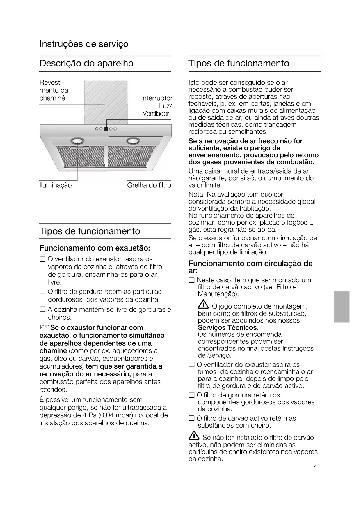 Antes da primeira utilização Indicações importantes:❑ Estas instruções de serviço aplicam-se avários modelos de aparelhos. É. por isso, possível que se encontremdescritas várias características de equipamento que não dizem respeito aoseu aparelho.❑ Este exaustor corresponde às normasde segurança para este tipo de aparelhos.As reparações só devem ser efectuadas por pessoal especializado.Reparações inadequadas podem acarretar perigos vários para o utilizador.❑ Antes de utilizar o novo aparelho, deveráler com atenção estas instruções de serviço.Delas constam informações importantespara a sua segurança, bem como sobrea utilização e manutenção do aparelho.❑ Guarde as instruções de serviço e demontagem em lugar seguro, para aeventualidade de o aparelho ter um outrodono. Anomalias Em caso de eventuais dúvidas ou anoma-lias, deverá contactar os nossos ServiçosTécnicos. (Ver Índice de Postos de Assistência).Sempre que contactar os Serviços Técnicos, agradecemos que indique osseguintes dados: E-NR. FD Registe nestes campos os dados do seuaparelho. Estes elementos constam dachapa de características, que se encontrano interior do exaustor, depois de retirar ofiltro de gordura. Se o aparelho apresentar qualquer dano, não o deverá pôr em funcionamento. A ligação e a colocação em funcionamento só devem ser efectuadaspor um técnico. Se o cabo de ligação deste aparelho estiver danificado, ele terá que ser substituido pelo fabricante, pelos seus Serviços Técnicos ou, ainda, por uma pessoa qualificada, a fim de se evitaremsituações de perigo para o utilizador. Providenciar a reciclagem adequada do material da embalagem (ver Instruções deMontagem). Este exaustor só deve ser aplicado para fins domésticos. O exaustor só deve funcionar com as lâmpadas colocadas. As lâmpadas fundidas devem ser imediatamente substituidas, para evitar asobrecarga das outras lâmpadas. O exaustor não deve funcionar sem o filtro de gordura. Gordura ou óleo sobreaquecidos podem incendiar-se facilmente.Sempre que preparar alimentos com gorduraou óleo, por ex. batatas fritas, deverá, porisso, manter-se vigilante. Não flamejar alimentos por baixo do exaustor.Perigo de incêndio do filtro de gordura, ! devido à subida da chama.