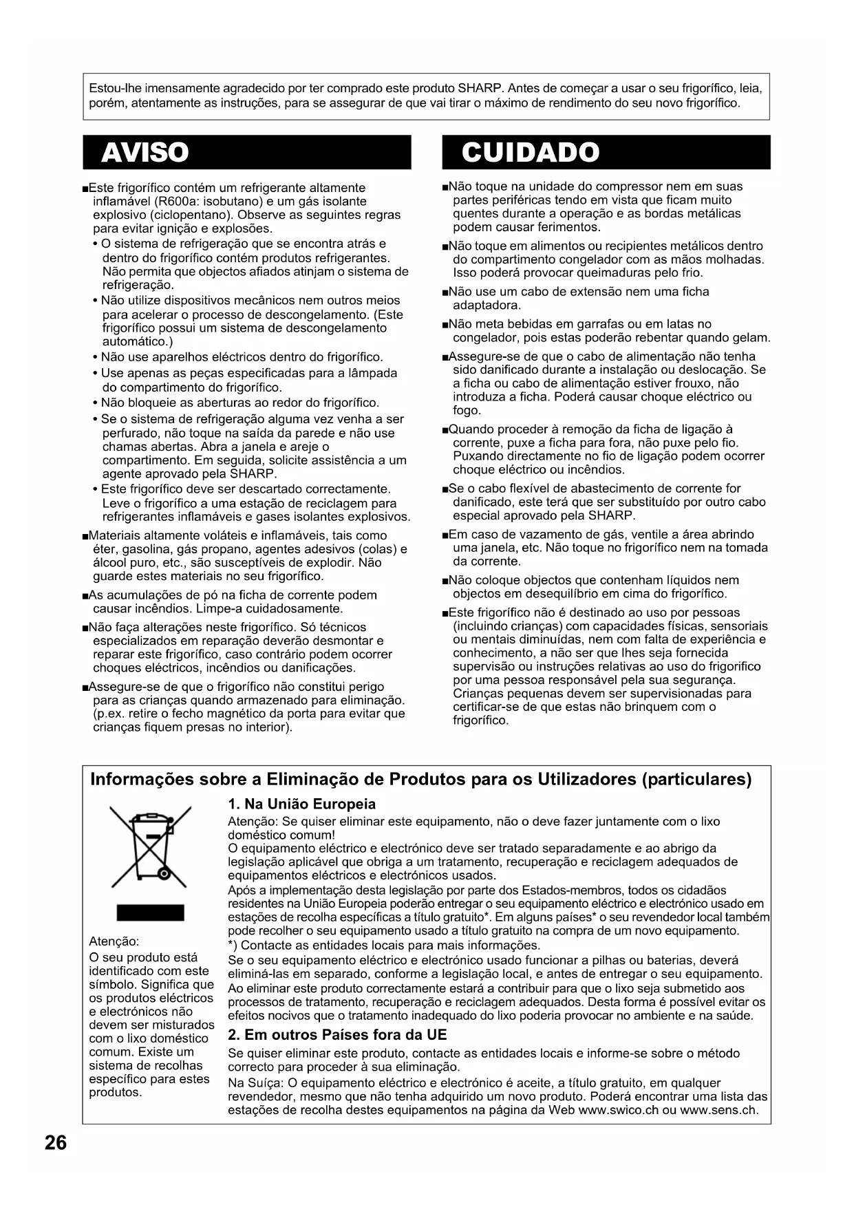 - Este frigorífico deve ser descartado correctamente. Leve o frigorífico a uma estação de reciclagem para refrigerantes inflamáveis e gases isolantes explosivos. ■ Materiais altamente voláteis e inflamáveis, tais como éter, gasolina, gás propano, agentes adesivos (colas) e álcool puro, etc., são susceptíveis de explodir. Não guarde estes materiais no seu frigorífico. ■ As acumulações de pó na ficha de corrente podem causar incêndios. Limpe-a cuidadosamente. ■ Não faça alterações neste frigorífico. Só técnicos especializados em reparação deverão desmontar e reparar este frigorífico, caso contrário podem ocorrer choques eléctricos, incêndios ou danificações. ■ Assegure-se de que o frigorífico não constitui perigo para as crianças quando armazenado para eliminação. (p.ex. retire o fecho magnético da porta para evitar que crianças fiquem presas no interior). ■ Não toque na unidade do compressor nem em suas partes periféricas tendo em vista que ficam muito quentes durante a operação e as bordas metálicas podem causar ferimentos. ■ Não toque em alimentos ou recipientes metálicos dentro do compartimento congelador com as mãos molhadas. Isso poderá provocar queimaduras pelo frio. ■ Não use um cabo de extensão nem uma ficha adaptadora. ■ Não meta bebidas em garrafas ou em latas no congelador, pois estas poderão rebentar quando gelam. ■ Assegure-se de que o cabo de alimentação não tenha sido danificado durante a instalação ou deslocação. Se a ficha ou cabo de alimentação estiver frouxo, não introduza a ficha. Poderá causar choque eléctrico ou fogo. ■ Quando proceder à remoção da ficha de ligação à corrente, puxe a ficha para fora, não puxe pelo fio. Puxando directamente no fio de ligação podem ocorrer choque eléctrico ou incêndios. ■ Se o cabo flexível de abastecimento de corrente for danificado, este terá que ser substituído por outro cabo especial aprovado pela SHARP. ■ Em caso de vazamento de gás, ventile a área abrindo uma janela, etc. Não toque no frigorífico nem na tomada da corrente. ■ Não coloque objectos que contenham líquidos nem objectos em desequilíbrio em cima do frigorífico. ■ Este frigorífico não é destinado ao uso por pessoas (incluindo crianças) com capacidades físicas, sensoriais ou mentais diminuídas, nem com falta de experiência e conhecimento, a não ser que lhes seja fornecida supervisão ou instruções relativas ao uso do frigorifico por uma pessoa responsável pela sua segurança. Crianças pequenas devem ser supervisionadas para certificar-se de que estas não brinquem com o frigorífico. Estou-lhe imensamente agradecido por ter comprado este produto SHARP. Antes de começar a usar o seu frigorífico, leia, porém, atentamente as instruções, para se assegurar de que vai tirar o máximo de rendimento do seu novo frigorífico. AVISO CUIDADO Informações sobre a Eliminação de Produtos para os Utilizadores (particulares)