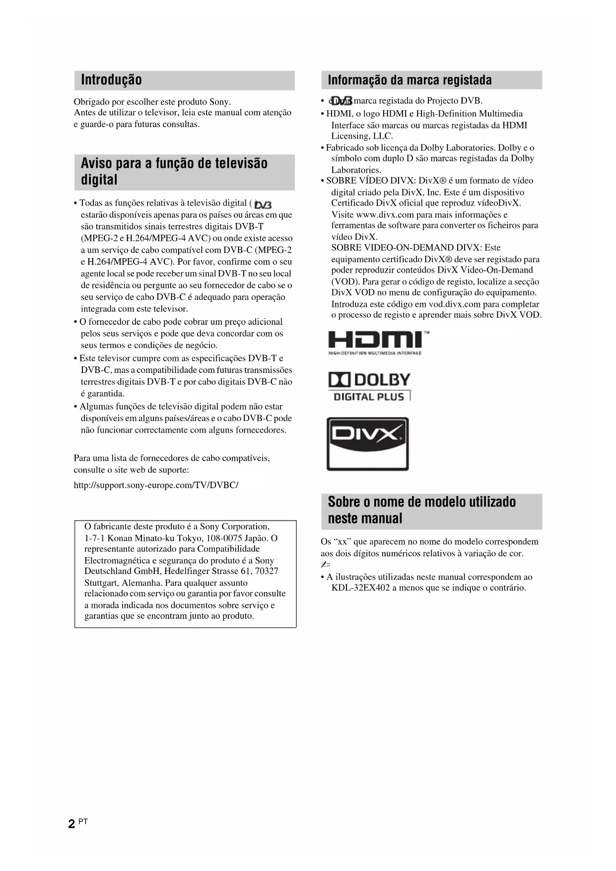 PT KDL-40/32P36xx KDL-40/37/32P56xx KDL-40/37/32S56xx 4-152-587-21 Informações adicionais