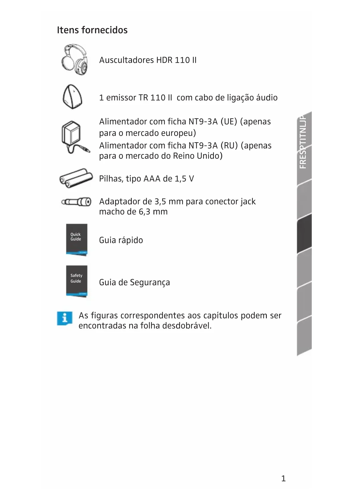 Itens fornecidos Auscultadores HDR 110 II 1 emissor TR 110 II com cabo de ligação áudio Alimentador com ficha NT9-3A (UE) (apenas para o mercado europeu) Alimentador com ficha NT9-3A (RU) (apenas para o mercado do Reino Unido) Pilhas, tipo AAA de 1,5 V Adaptador de 3,5 mm para conector jack macho de 6,3 mm Quick Guide Guia rápido Safety Guide Guia de Segurança As figuras correspondentes aos capítulos podem ser encontradas na folha desdobrável.2 Preparar o emissor para utilização