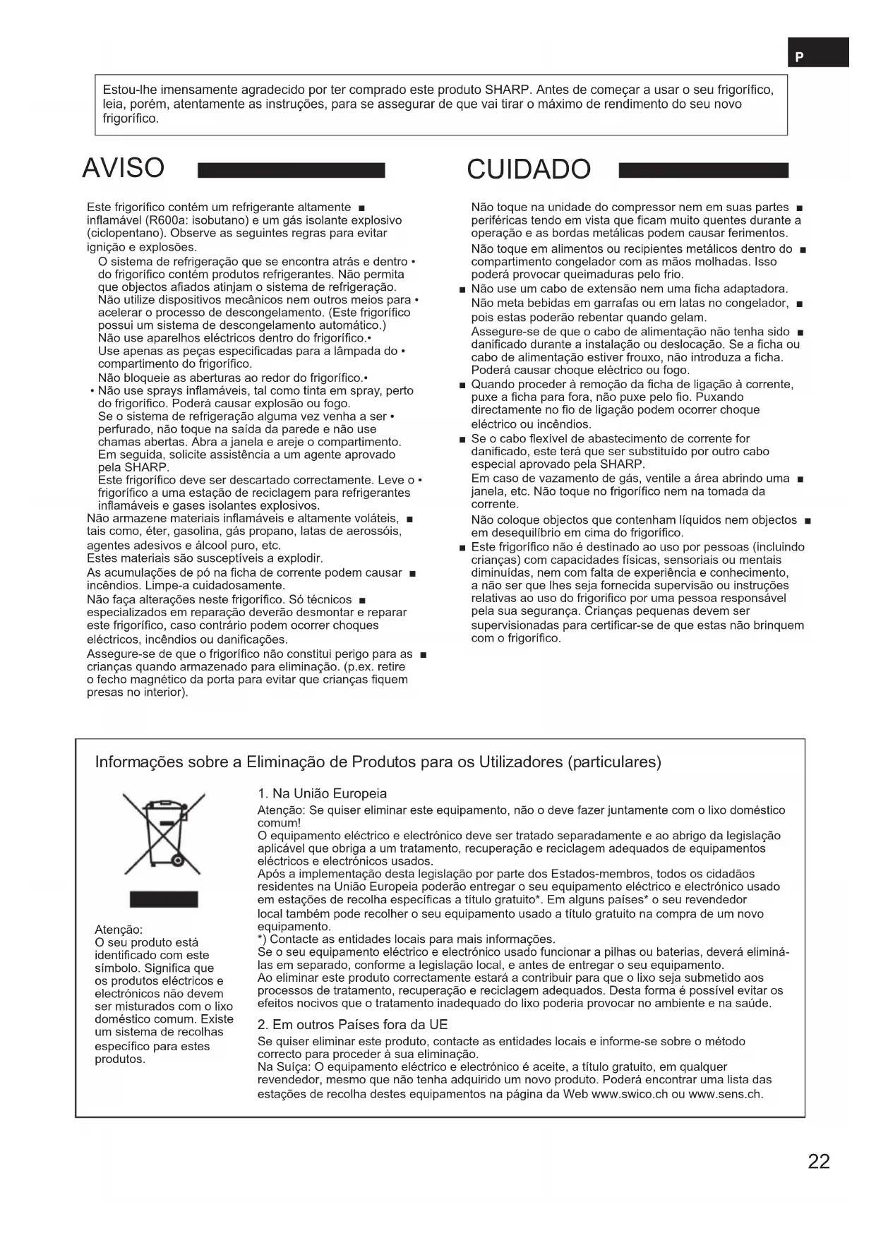 F22 Estou-lhe imensamente agradecido por ter comprado este produto SHARP. Antes de começar a usar o seu frigorífico, leia, porém, atentamente as instruções, para se assegurar de que vai tirar o máximo de rendimento do seu novo frigorífico. Este frigorífico contém um refrigerante altamente ■inflamável (R600a: isobutano) e um gás isolante explosivo (ciclopentano). Observe as seguintes regras para evitar ignição e explosões.O sistema de refrigeração que se encontra atrás e dentro • do frigorífico contém produtos refrigerantes. Não permita que objectos afiados atinjam o sistema de refrigeração.Não utilize dispositivos mecânicos nem outros meios para • acelerar o processo de descongelamento. (Este frigorífico possui um sistema de descongelamento automático.)Não use aparelhos eléctricos dentro do frigorífico.• Use apenas as peças especificadas para a lâmpada do • compartimento do frigorífico.Não bloqueie as aberturas ao redor do frigorífico.• Não use sprays inflamáveis, tal como tinta em spray, perto • do frigorífico. Poderá causar explosão ou fogo.Se o sistema de refrigeração alguma vez venha a ser • perfurado, não toque na saída da parede e não use chamas abertas. Abra a janela e areje o compartimento. Em seguida, solicite assistência a um agente aprovado pela SHARP.Este frigorífico deve ser descartado correctamente. Leve o • frigorífico a uma estação de reciclagem para refrigerantes inflamáveis e gases isolantes explosivos.Não armazene materiais inflamáveis e altamente voláteis, ■tais como, éter, gasolina, gás propano, latas de aerossóis, agentes adesivos e álcool puro, etc. Estes materiais são susceptíveis a explodir.As acumulações de pó na ficha de corrente podem causar ■incêndios. Limpe-a cuidadosamente.Não faça alterações neste frigorífico. Só técnicos ■especializados em reparação deverão desmontar e reparar este frigorífico, caso contrário podem ocorrer choques eléctricos, incêndios ou danificações.Assegure-se de que o frigorífico não constitui perigo para as ■crianças quando armazenado para eliminação. (p.ex. retire o fecho magnético da porta para evitar que crianças fiquem presas no interior). AVISO CUIDADO Não toque na unidade do compressor nem em suas partes ■periféricas tendo em vista que ficam muito quentes durante a operação e as bordas metálicas podem causar ferimentos.Não toque em alimentos ou recipientes metálicos dentro do ■compartimento congelador com as mãos molhadas. Isso poderá provocar queimaduras pelo frio. Não use um cabo de extensão nem uma ficha adaptadora. ■ Não meta bebidas em garrafas ou em latas no congelador, ■pois estas poderão rebentar quando gelam.Assegure-se de que o cabo de alimentação não tenha sido ■danificado durante a instalação ou deslocação. Se a ficha ou cabo de alimentação estiver frouxo, não introduza a ficha. Poderá causar choque eléctrico ou fogo. Quando proceder à remoção da ficha de ligação à corrente, ■ puxe a ficha para fora, não puxe pelo fio. Puxando directamente no fio de ligação podem ocorrer choque eléctrico ou incêndios. Se o cabo flexível de abastecimento de corrente for ■ danificado, este terá que ser substituído por outro cabo especial aprovado pela SHARP.Em caso de vazamento de gás, ventile a área abrindo uma ■janela, etc. Não toque no frigorífico nem na tomada da corrente.Não coloque objectos que contenham líquidos nem objectos ■em desequilíbrio em cima do frigorífico. Este frigorífico não é destinado ao uso por pessoas (incluindo ■ crianças) com capacidades físicas, sensoriais ou mentais diminuídas, nem com falta de experiência e conhecimento, a não ser que lhes seja fornecida supervisão ou instruções relativas ao uso do frigorifico por uma pessoa responsável pela sua segurança. Crianças pequenas devem ser supervisionadas para certificar-se de que estas não brinquem com o frigorífico. Informações sobre a Eliminação de Produtos para os Utilizadores (particulares)