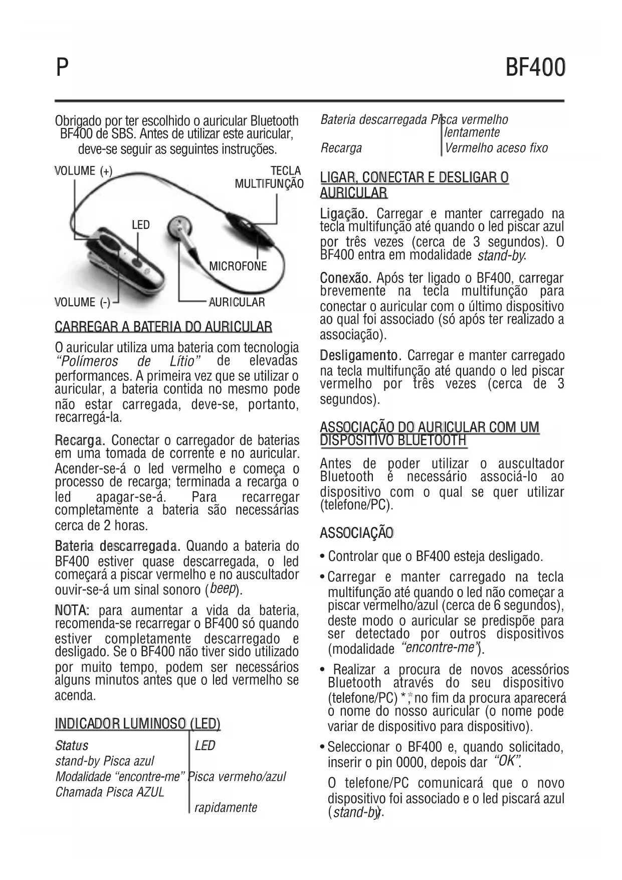 NNOOTTAA:: para aumentar a vida da bateria, recomenda-se recarregar o BF400 só quando estiver completamente descarregado e desligado. Se o BF400 não tiver sido utilizado por muito tempo, podem ser necessários alguns minutos antes que o led vermelho se acenda. IINNDDIICCAADDOORR LLUUMMIINNOOSSOO ((LLEEDD)) SSttaattuuss LLEEDD stand-by Pisca azul Modalidade “encontre-me” Pisca vermeho/azul Chamada Pisca AZUL rapidamente Bateria descarregada Pisca vermelho lentamente Recarga Vermelho aceso fixo