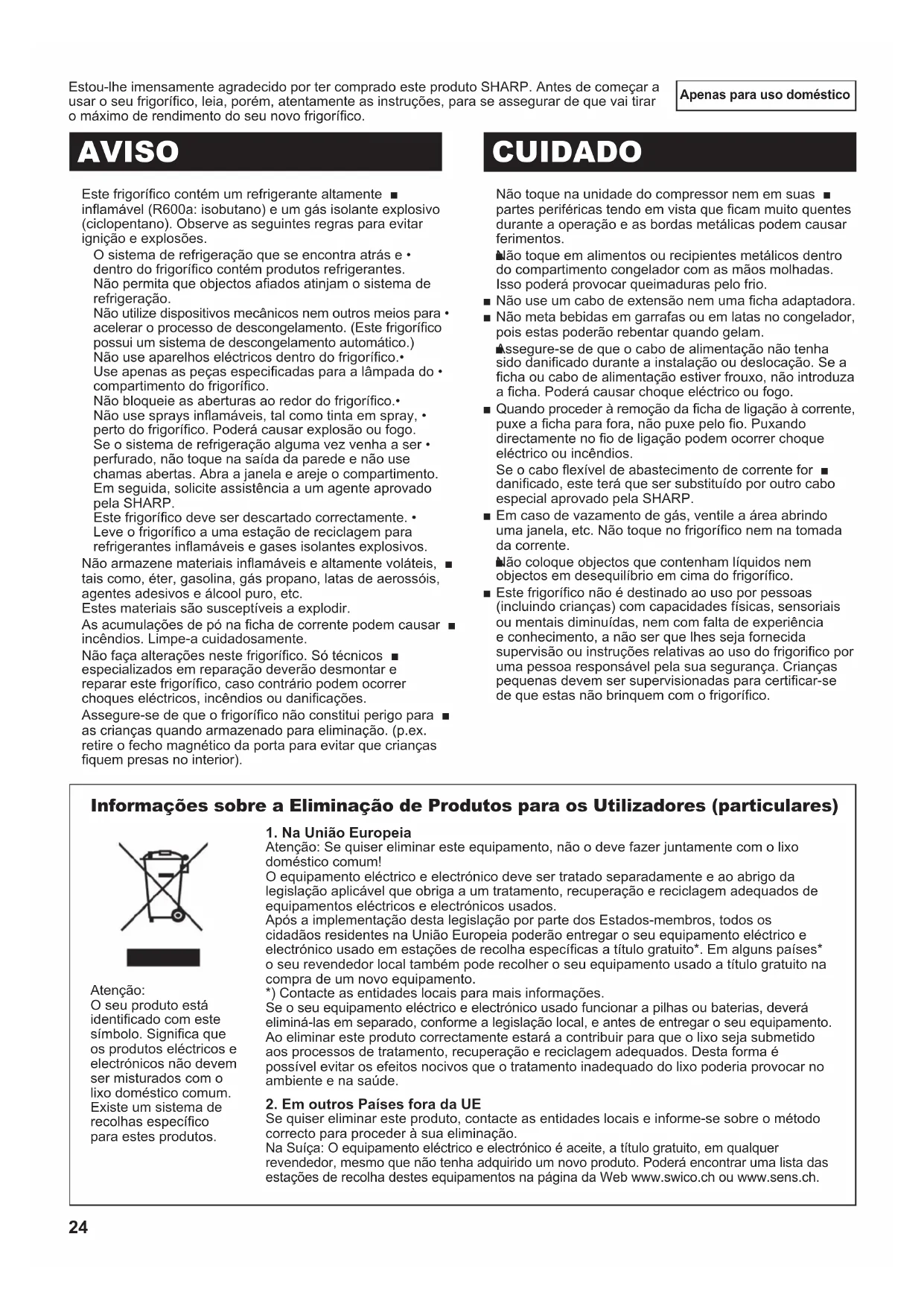 (B191)-West.indb 5 2011/03/14 13:13:2924 Apenas para uso doméstico Estou-lhe imensamente agradecido por ter comprado este produto SHARP. Antes de começar a usar o seu frigoríco, leia, porém, atentamente as instruções, para se assegurar de que vai tirar o máximo de rendimento do seu novo frigoríco. Este frigoríco contém um refrigerante altamente ■ inamável (R600a: isobutano) e um gás isolante explosivo (ciclopentano). Observe as seguintes regras para evitar ignição e explosões. O sistema de refrigeração que se encontra atrás e • dentro do frigoríco contém produtos refrigerantes. Não permita que objectos aados atinjam o sistema de refrigeração. Não utilize dispositivos mecânicos nem outros meios para • acelerar o processo de descongelamento. (Este frigoríco possui um sistema de descongelamento automático.) Não use aparelhos eléctricos dentro do frigoríco.• Use apenas as peças especicadas para a lâmpada do • compartimento do frigoríco. Não bloqueie as aberturas ao redor do frigoríco.• Não use sprays inamáveis, tal como tinta em spray, • perto do frigoríco. Poderá causar explosão ou fogo. Se o sistema de refrigeração alguma vez venha a ser • perfurado, não toque na saída da parede e não use chamas abertas. Abra a janela e areje o compartimento. Em seguida, solicite assistência a um agente aprovado pela SHARP. Este frigoríco deve ser descartado correctamente. • Leve o frigoríco a uma estação de reciclagem para refrigerantes inamáveis e gases isolantes explosivos. Não armazene materiais inamáveis e altamente voláteis, ■ tais como, éter, gasolina, gás propano, latas de aerossóis, agentes adesivos e álcool puro, etc. Estes materiais são susceptíveis a explodir. As acumulações de pó na cha de corrente podem causar ■ incêndios. Limpe-a cuidadosamente. Não faça alterações neste frigoríco. Só técnicos ■ especializados em reparação deverão desmontar e reparar este frigoríco, caso contrário podem ocorrer choques eléctricos, incêndios ou danicações. Assegure-se de que o frigoríco não constitui perigo para ■ as crianças quando armazenado para eliminação. (p.ex. retire o fecho magnético da porta para evitar que crianças quem presas no interior). AVISO CUIDADO Não toque na unidade do compressor nem em suas ■ partes periféricas tendo em vista que cam muito quentes durante a operação e as bordas metálicas podem causar ferimentos. Não toque em alimentos ou recipientes metálicos dentro ■ do compartimento congelador com as mãos molhadas. Isso poderá provocar queimaduras pelo frio. Não use um cabo de extensão nem uma cha adaptadora. ■ Não meta bebidas em garrafas ou em latas no congelador, ■ pois estas poderão rebentar quando gelam. Assegure-se de que o cabo de alimentação não tenha ■ sido danicado durante a instalação ou deslocação. Se a cha ou cabo de alimentação estiver frouxo, não introduza a cha. Poderá causar choque eléctrico ou fogo. Quando proceder à remoção da cha de ligação à corrente, ■ puxe a cha para fora, não puxe pelo o. Puxando directamente no o de ligação podem ocorrer choque eléctrico ou incêndios. Se o cabo exível de abastecimento de corrente for ■ danicado, este terá que ser substituído por outro cabo especial aprovado pela SHARP. Em caso de vazamento de gás, ventile a área abrindo ■ uma janela, etc. Não toque no frigoríco nem na tomada da corrente. Não coloque objectos que contenham líquidos nem ■ objectos em desequilíbrio em cima do frigoríco. Este frigoríco não é destinado ao uso por pessoas ■ (incluindo crianças) com capacidades físicas, sensoriais ou mentais diminuídas, nem com falta de experiência e conhecimento, a não ser que lhes seja fornecida supervisão ou instruções relativas ao uso do frigorico por uma pessoa responsável pela sua segurança. Crianças pequenas devem ser supervisionadas para certicar-se de que estas não brinquem com o frigoríco. Informações sobre a Eliminação de Produtos para os Utilizadores (particulares)