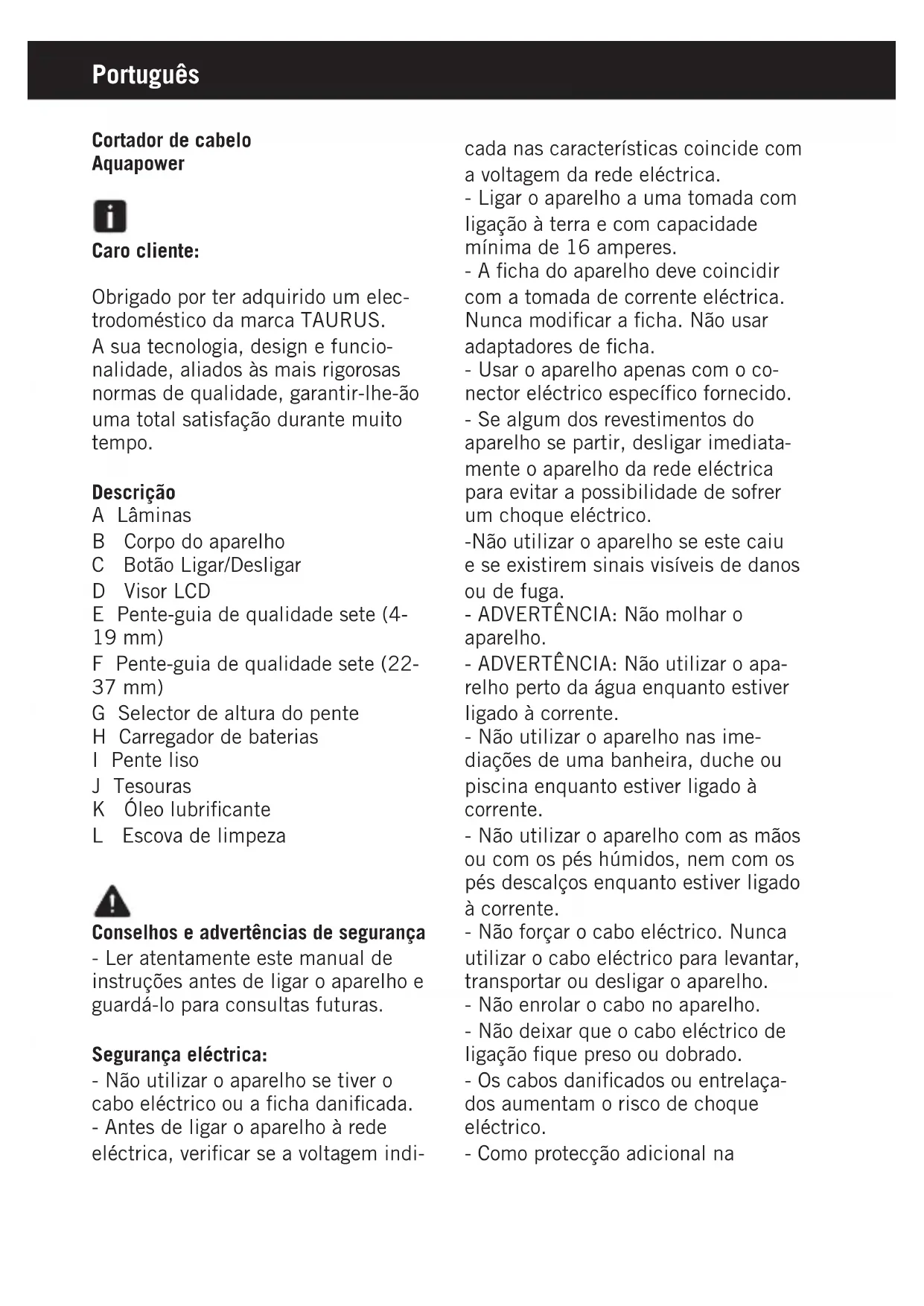 Aquapower - Aparador de barba TAURUS - Manual de utilização gratuito