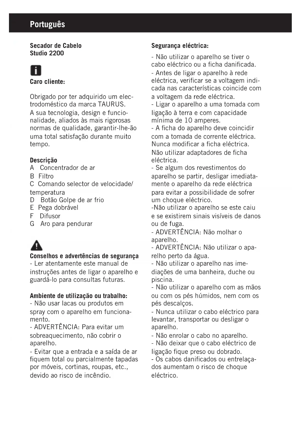 Studio 2200 - Secador de cabelo TAURUS - Manual de utilização gratuito