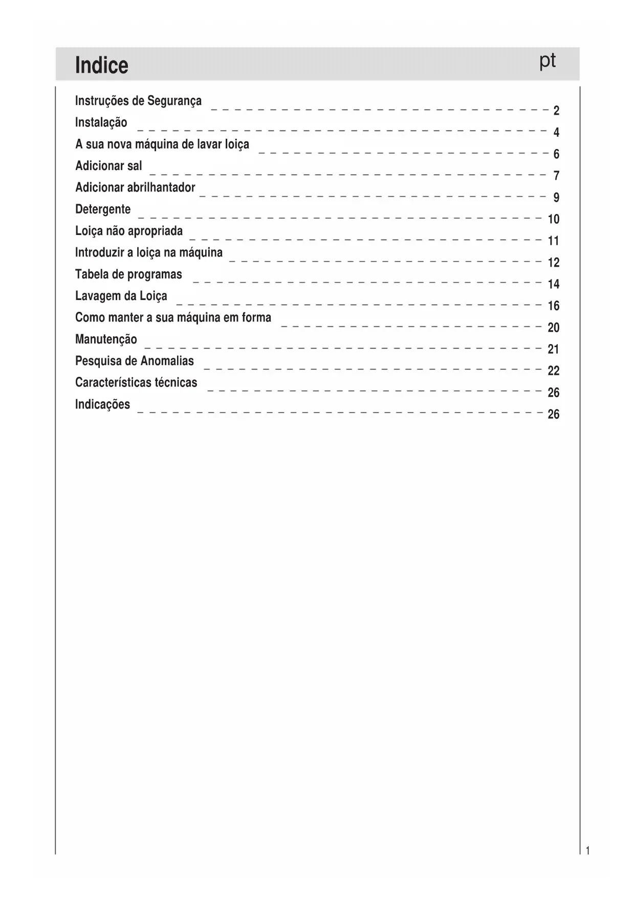a máquina aguarda uma nova programação.20 Após cada lavagem Após cada lavagem, feche a água e deixe a porta entreaberta de modo a que a humidade e os odores não fiquem retidos no interior do aparelho. Retirar a ficha Antes de qualquer operação de limpeza ou manutenção, retire sempre a ficha da tomada. Não corra riscos. Solventes ou produtos de limpeza abrasivos Não utilize solventes ou produtos de limpeza abrasivos para limpar o exterior e as partes de borracha da máquina. Utilize um pano com água morna e sabão. Para eliminar manchas da superfície interior, utilize um pano embebido em água e um pouco de vinagre branco ou então, um produto de limpeza específico para máquinas de lavar loiça. Quando for de férias Quando for de férias, execute um ciclo de lavagem com a máquina vazia e, depois, retire a ficha da tomada, feche a água e deixe a porta do aparelho entreaberta. Tal ajudará a aumentar a durabilidade das juntas e a evitar a formação de odores no interior do aparelho. Deslocar o aparelho Se tiver de deslocar o aparelho, tente mantê-lo na posição vertical. Poderá deslocá-lo com a parte traseira virada para baixo, se tal for absolutamente necessário. Juntas Um dos factores que originam a formação de odores na máquina é a acumulação de resíduos nas juntas. Uma limpeza periódica com uma esponja impedirá que tal aconteça. Não deixe a porta aberta para evitar tropeçar.