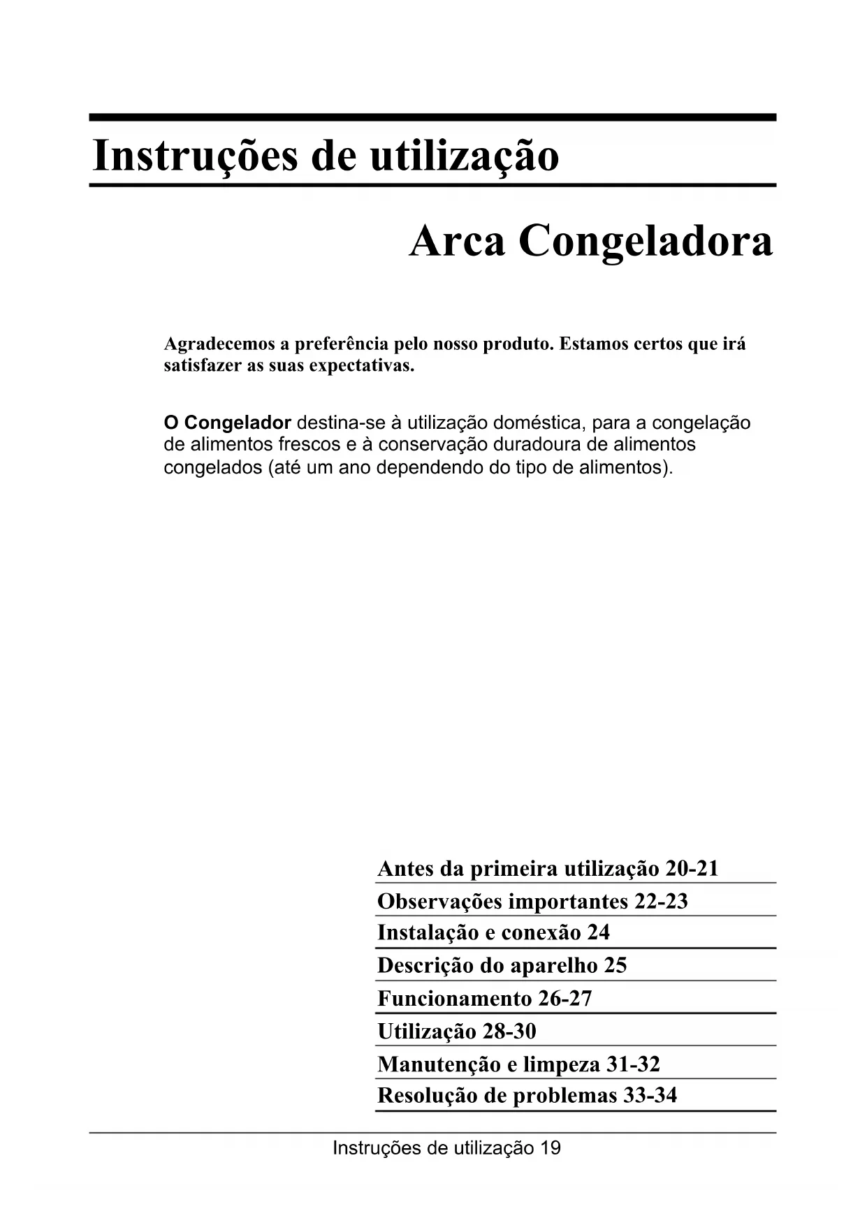 DEL APARATO.Instruções de utilização 19 Instruções de utilização Arca Congeladora Agradecemos a preferência pelo nosso produto. Estamos certos que irá satisfazer as suas expectativas. O Congelador destina-se à utilização doméstica, para a congelação de alimentos frescos e à conservação duradoura de alimentos congelados (até um ano dependendo do tipo de alimentos). Antes da primeira utilização 20-21 Observações importantes 22-23 Instalação e conexão 24 Descrição do aparelho 25 Funcionamento 26-27 Utilização 28-30 Manutenção e limpeza 31-32 Resolução de problemas 33-34Instruções de utilização20 Antes da primeira utilização