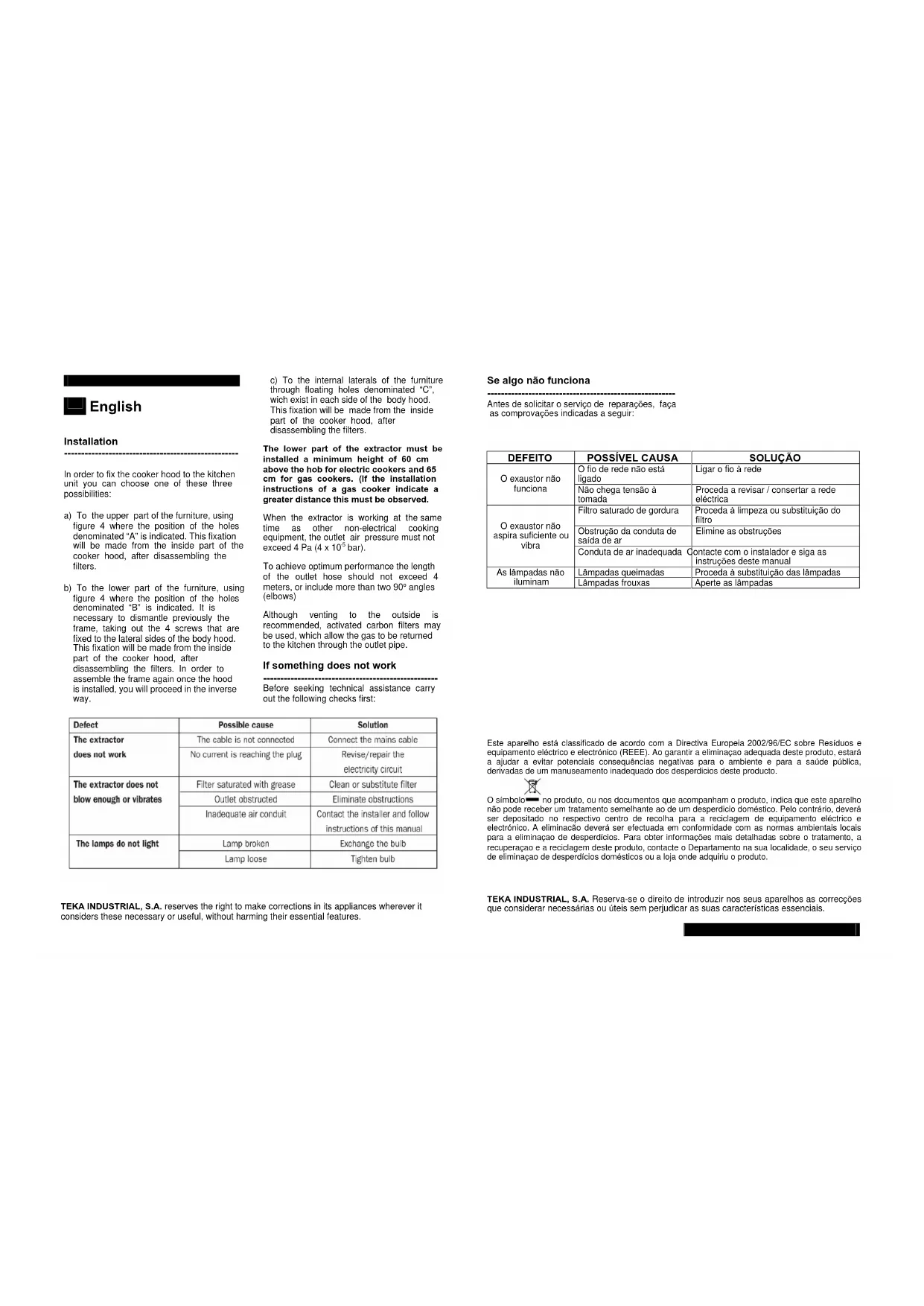 TEKA INDUSTRIAL, S.A. Reserva-se o direito de introduzir nos seus aparelhos as correcções