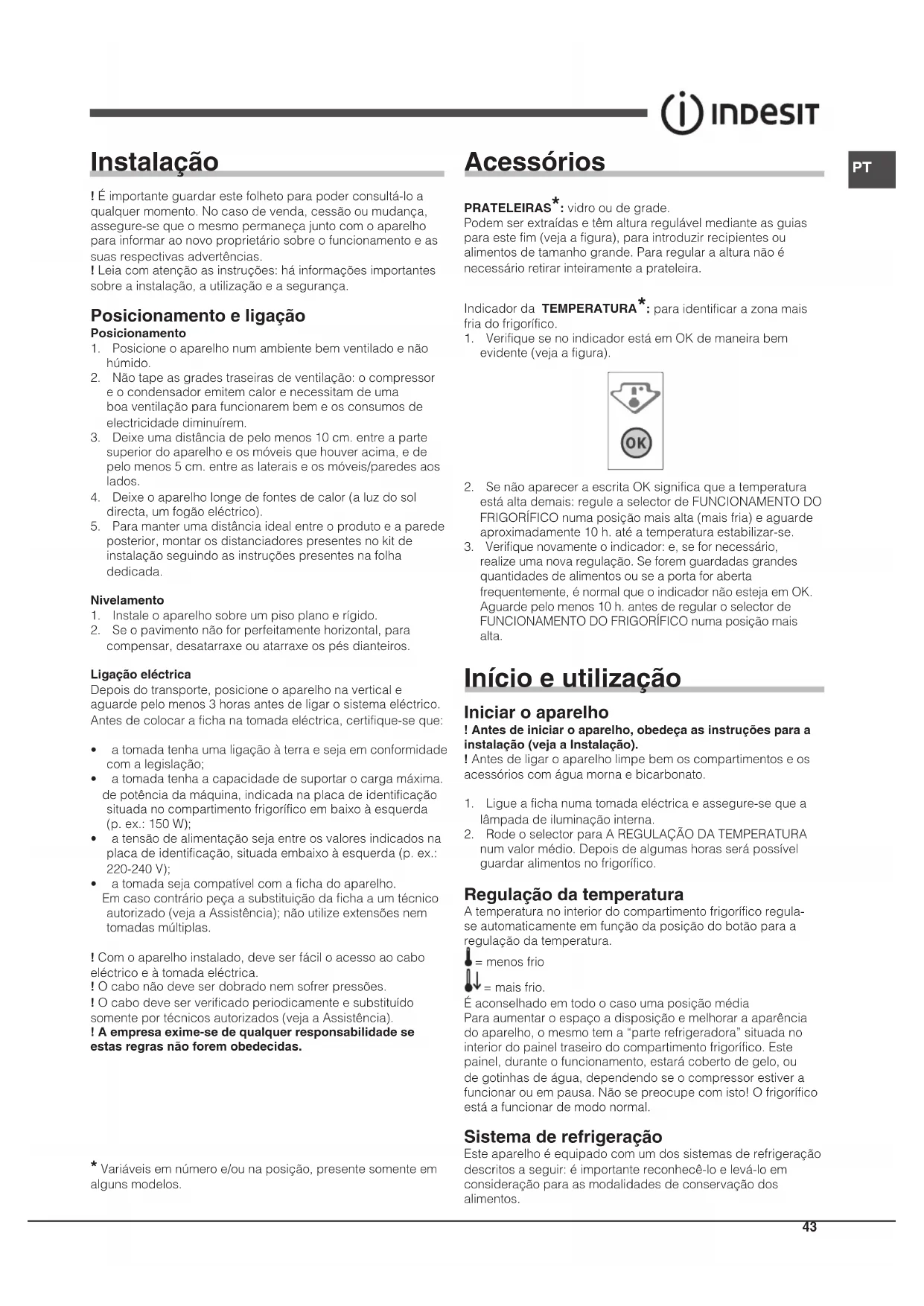 Instalação !Éimportanteguardarestefolhetoparapoderconsultá-loaqualquermomento.Nocasodevenda,cessãooumudança,assegure-sequeomesmopermaneçajuntocomoaparelhoparainformaraonovoproprietáriosobreofuncionamentoeassuasrespectivasadvertências.! Leiacomatençãoasinstruções:háinformaçõesimportantessobreainstalação,autilizaçãoeasegurança. Posicionamento e ligação Posicionamento1. Posicioneoaparelhonumambientebemventiladoenãohúmido.2. Nãotapeasgradestraseirasdeventilação:ocompressoreocondensadoremitemcalorenecessitamdeumaboaventilaçãoparafuncionarembemeosconsumosdeelectricidadediminuírem.3. Deixeumadistânciadepelomenos10cm.entreapartesuperiordoaparelhoeosmóveisquehouveracima,edepelomenos5cm.entreaslateraiseosmóveis/paredesaoslados.4. Deixeoaparelholongedefontesdecalor(aluzdosoldirecta,umfogãoeléctrico).5. Paramanterumadistânciaidealentreoprodutoeaparedeposterior,montarosdistanciadorespresentesnokitdeinstalaçãoseguindoasinstruçõespresentesnafolhadedicada.Nivelamento1. Instaleoaparelhosobreumpisoplanoerígido.2. Seopavimentonãoforperfeitamentehorizontal,paracompensar,desatarraxeouatarraxeospésdianteiros.Ligação eléctricaDepoisdotransporte,posicioneoaparelhonaverticaleaguardepelomenos3horasantesdeligarosistemaeléctrico.Antesdecolocarafichanatomadaeléctrica,certifique-seque:• atomadatenhaumaligaçãoàterraesejaemconformidadecomalegislação;• atomadatenhaacapacidadedesuportarocargamáxima. depotênciadamáquina,indicadanaplacadeidentificaçãosituadanocompartimentofrigoríficoembaixoàesquerda(p.ex.:150W);• atensãodealimentaçãosejaentreosvaloresindicadosnaplacadeidentificação,situadaembaixoàesquerda(p.ex.:220-240V);• atomadasejacompatívelcomafichadoaparelho. Emcasocontráriopeçaasubstituiçãodafichaaumtécnicoautorizado(vejaaAssistência);nãoutilizeextensõesnemtomadasmúltiplas.!Comoaparelhoinstalado,deveserfáciloacessoaocaboeléctricoeàtomadaeléctrica.!Ocabonãodeveserdobradonemsofrerpressões.!Ocabodeveserverificadoperiodicamenteesubstituídosomenteportécnicosautorizados(vejaaAssistência).! A empresa exime-se de qualquer responsabilidade se estas regras não forem obedecidas. Acessórios PRATELEIRAS*:vidrooudegrade.Podemserextraídasetêmalturaregulávelmedianteasguiasparaestefim(vejaafigura),paraintroduzirrecipientesoualimentosdetamanhogrande.Pararegularaalturanãoénecessárioretirarinteiramenteaprateleira.IndicadordaTEMPERATURA *:paraidentificarazonamais friadofrigorífico.1. VerifiquesenoindicadorestáemOKdemaneirabemevidente(vejaafigura).2. SenãoapareceraescritaOKsignificaqueatemperaturaestáaltademais:reguleaselectordeFUNCIONAMENTODOFRIGORÍFICOnumaposiçãomaisalta(maisfria)eaguardeaproximadamente10h.atéatemperaturaestabilizar-se.3. Verifiquenovamenteoindicador:e,sefornecessário,realizeumanovaregulação.Seforemguardadasgrandesquantidadesdealimentosouseaportaforabertafrequentemente,énormalqueoindicadornãoestejaemOK.Aguardepelomenos10h.antesderegularoselectordeFUNCIONAMENTODOFRIGORÍFICOnumaposiçãomaisalta. Início e utilização