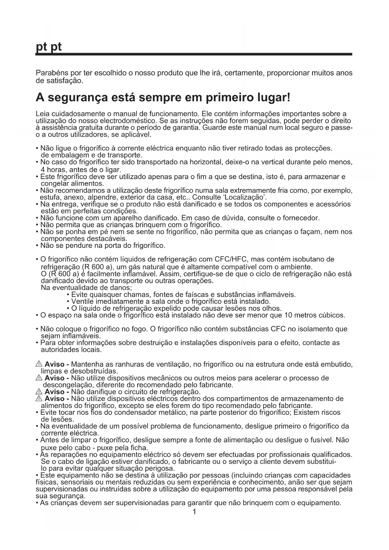 • Não coloque o frigorífico no fogo. O frigorífico não contém substâncias CFC no isolamento que