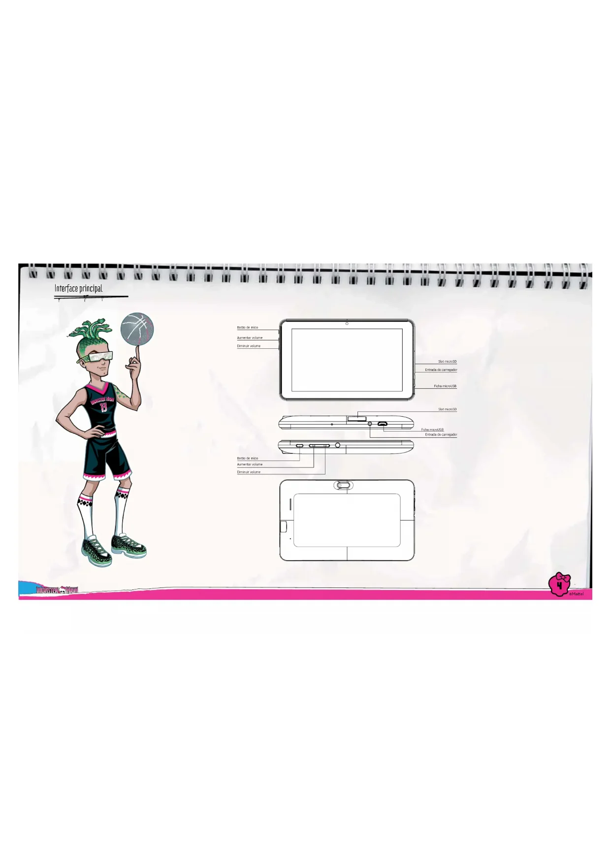 Conteudo da embalagem: ©Mael Interface principal Botão de início Botão de início Aumentar volume Aumentar volume Diminuir volume Diminuir volume Entrada do carregador Entrada do carregador Slot microSD Slot microSD Ficha microUSB Ficha microUSB ©Mael Carga O seu tablet só pode ser carregado com o adaptador de energia fornecido. Ligue o adaptador na tomada de energia e o conector do cabo do adaptador na entrada do Tablet. Ecra principal Estes são os principais ícones que aparecem no ecrã principal do seu Tablet Monster High: