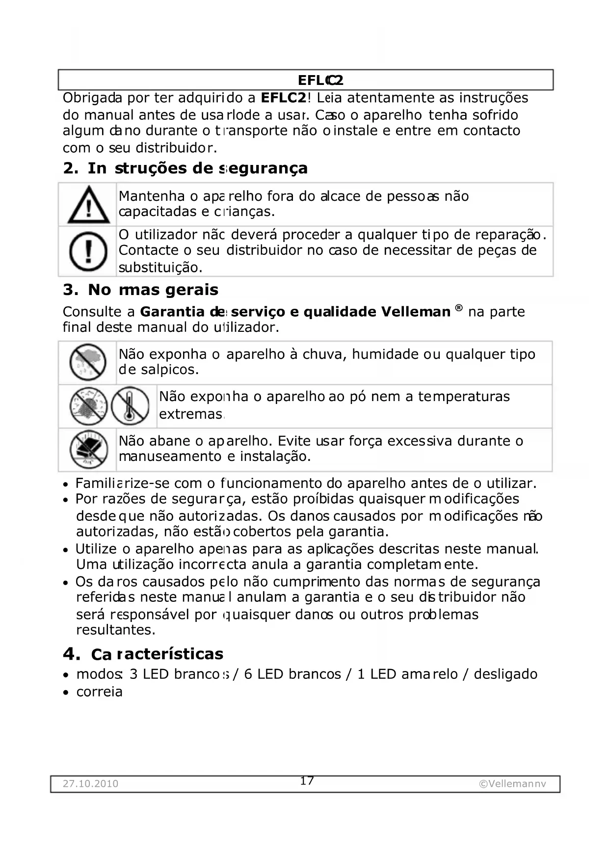 Utilize este aparelho apenas com acessórios originais. A Velleman NV não sera responsable por quaisquer danos ou lesões causados pelo uso (indevido) do aparelho. Para mais informação sobre este produit e para obter uma versão mais recente destemanual,visite a)nossa paga www.velleman.eu. Podem alterar-se as espécicações e o conteudo destemanual sem avis prévio.