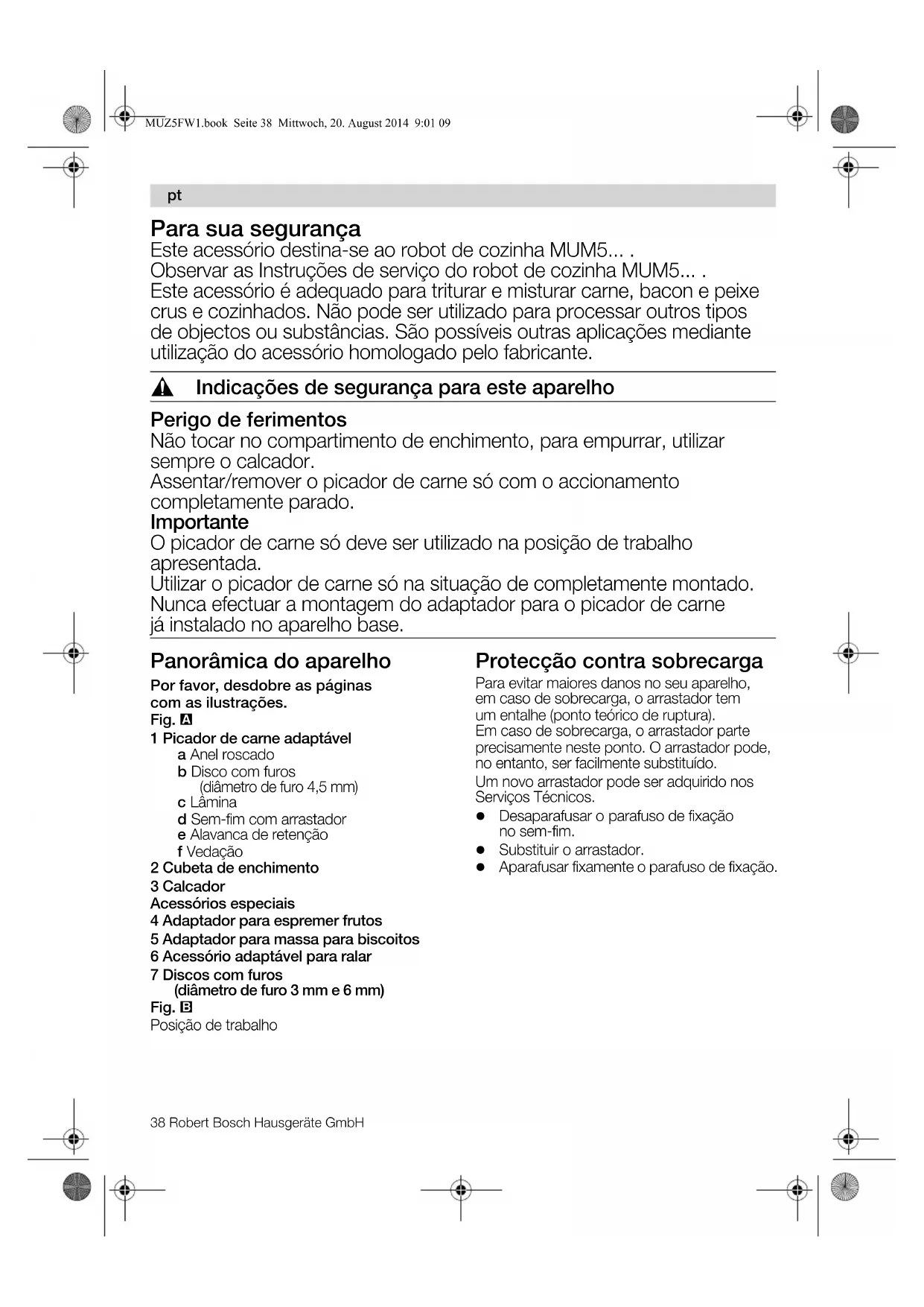 Wijzigingen voorbehouden. MUZ5FW1.book Seite 37 Mittwoch, 20. August 2014 9:01 0938 Robert Bosch Hausgeräte GmbH Para sua segurança Este acessório destina-se ao robot de cozinha MUM5... . Observar as Instruções de serviço do robot de cozinha MUM5... . Este acessório é adequado para triturar e misturar carne, bacon e peixe crus e cozinhados. Não pode ser utilizado para processar outros tipos de objectos ou substâncias. São possíveis outras aplicações mediante utilização do acessório homologado pelo fabricante. , Indicações de segurança para este aparelho Perigo de ferimentos Não tocar no compartimento de enchimento, para empurrar, utilizar sempre o calcador. Assentar/remover o picador de carne só com o accionamento completamente parado. Importante O picador de carne só deve ser utilizado na posição de trabalho apresentada. Utilizar o picador de carne só na situação de completamente montado. Nunca efectuar a montagem do adaptador para o picador de carne já instalado no aparelho base. Panorâmica do aparelho Por favor, desdobre as páginas com as ilustrações. Fig. 1 Picador de carne adaptável a Anel roscado b Disco com furos