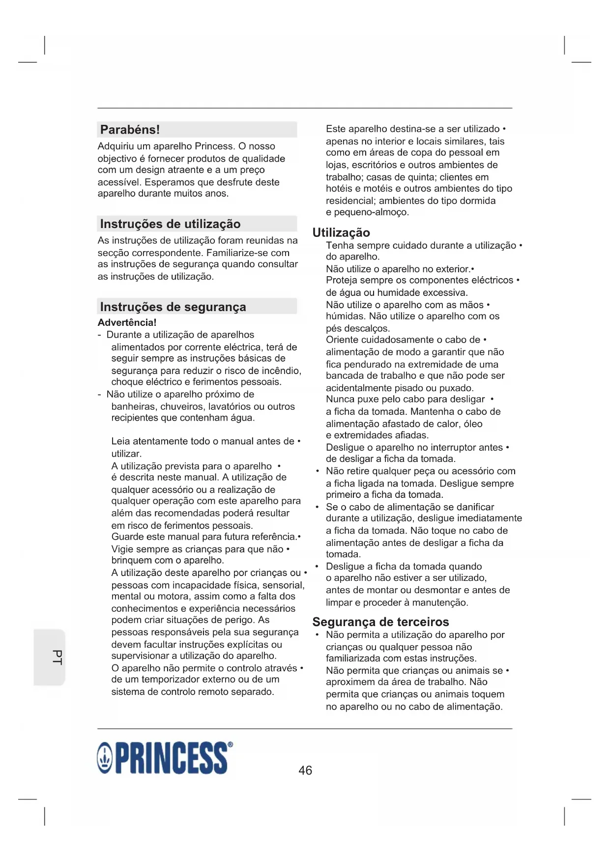 Parabéns! Adquiriu um aparelho Princess. O nosso objectivo é fornecer produtos de qualidade com um design atraente e a um preço acessível. Esperamos que desfrute deste aparelho durante muitos anos. Instruções de utilização As instruções de utilização foram reunidas na secção correspondente. Familiarize-se com as instruções de segurança quando consultar as instruções de utilização. Instruções de segurança Advertência! - Durante a utilização de aparelhos alimentados por corrente eléctrica, terá de seguir sempre as instruções básicas de segurança para reduzir o risco de incêndio, choque eléctrico e ferimentos pessoais. - Não utilize o aparelho próximo de banheiras, chuveiros, lavatórios ou outros recipientes que contenham água. Leia atentamente todo o manual antes de • utilizar. A utilização prevista para o aparelho • é descrita neste manual. A utilização de qualquer acessório ou a realização de qualquer operação com este aparelho para além das recomendadas poderá resultar em risco de ferimentos pessoais. Guarde este manual para futura referência.• Vigie sempre as crianças para que não • brinquem com o aparelho. A utilização deste aparelho por crianças ou • pessoas com incapacidade física, sensorial, mental ou motora, assim como a falta dos conhecimentos e experiência necessários podem criar situações de perigo. As pessoas responsáveis pela sua segurança devem facultar instruções explícitas ou supervisionar a utilização do aparelho. O aparelho não permite o controlo através • de um temporizador externo ou de um sistema de controlo remoto separado. Este aparelho destina-se a ser utilizado • apenas no interior e locais similares, tais como em áreas de copa do pessoal em lojas, escritórios e outros ambientes de trabalho; casas de quinta; clientes em hotéis e motéis e outros ambientes do tipo residencial; ambientes do tipo dormida e pequeno-almoço. Utilização Tenha sempre cuidado durante a utilização • do aparelho. Não utilize o aparelho no exterior.• Proteja sempre os componentes eléctricos • de água ou humidade excessiva. Não utilize o aparelho com as mãos • húmidas. Não utilize o aparelho com os pés descalços. Oriente cuidadosamente o cabo de • alimentação de modo a garantir que não fica pendurado na extremidade de uma bancada de trabalho e que não pode ser acidentalmente pisado ou puxado. Nunca puxe pelo cabo para desligar • a ficha da tomada. Mantenha o cabo de alimentação afastado de calor, óleo e extremidades afiadas. Desligue o aparelho no interruptor antes • de desligar a ficha da tomada. Não retire qualquer peça ou acessório com • a ficha ligada na tomada. Desligue sempre primeiro a ficha da tomada. Se o cabo de alimentação se danificar • durante a utilização, desligue imediatamente a ficha da tomada. Não toque no cabo de alimentação antes de desligar a ficha da tomada. Desligue a ficha da tomada quando • o aparelho não estiver a ser utilizado, antes de montar ou desmontar e antes de limpar e proceder à manutenção. Segurança de terceiros Não permita a utilização do aparelho por • crianças ou qualquer pessoa não familiarizada com estas instruções. Não permita que crianças ou animais se • aproximem da área de trabalho. Não permita que crianças ou animais toquem no aparelho ou no cabo de alimentação.47