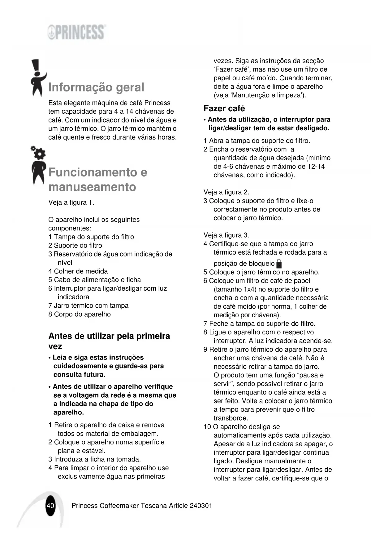 - 2002/96/EY40 Princess Coffeemaker Toscana Article 240301 Informação geral Esta elegante máquina de café Princess tem capacidade para 4 a 14 chávenas de café. Com um indicador do nível de água e um jarro térmico. O jarro térmico mantém o café quente e fresco durante várias horas. Funcionamento e manuseamento Veja a figura 1. O aparelho inclui os seguintes componentes: 1 Tampa do suporte do filtro 2 Suporte do filtro 3 Reservatório de água com indicação de nível 4 Colher de medida 5 Cabo de alimentação e ficha 6 Interruptor para ligar/desligar com luz indicadora 7 Jarro térmico com tampa 8 Corpo do aparelho Antes de utilizar pela primeira vez