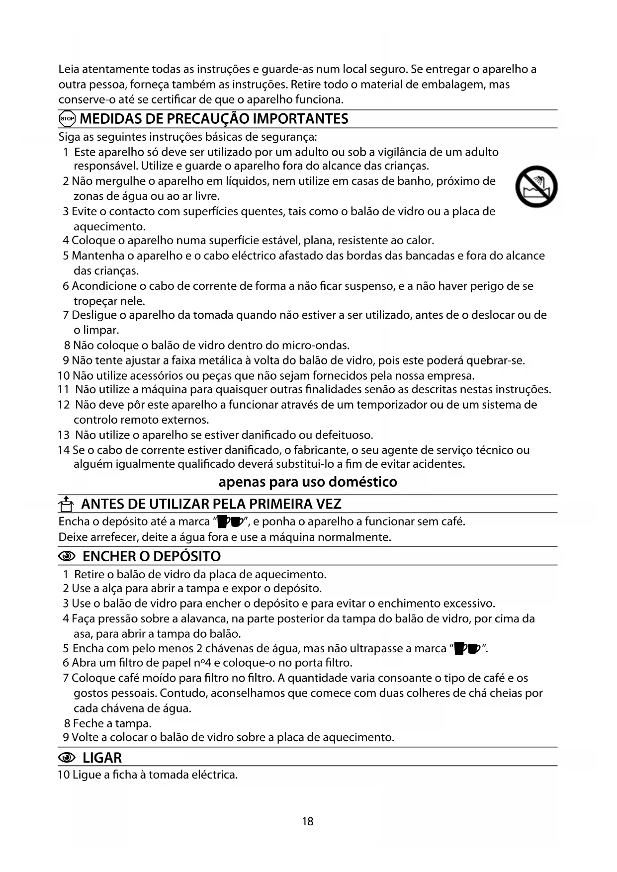 U ANTES DE UTILIZAR PELA PRIMEIRA VEZ Encha o depósito até a marca “:;”, e ponha o aparelho a funcionar sem café.