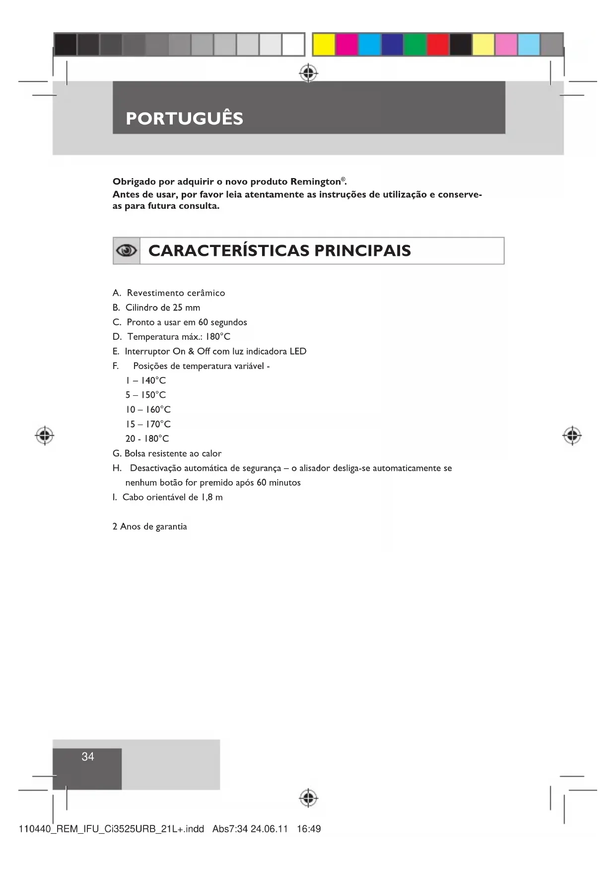 INFORMAÇÃO IMPORTANTE Devido às elevadas temperaturas que este alisador pode atingir, deve ter cuidado sacrescidos sempre que o utilizar. Durante o aquecimento, a utilização e o arrefecimento do aparelho, coloque-o sobre uma superfície lisa, uniforme e resistente ao calor. Segure na unidade apenas pela extremidade da pega. Este é um produto de efeito forte, pelo que deve evitar uma utilização frequente para não danificar o cabelo. De notar que a utilização regular de produtos de modelação pode deteriorar o revestimento. Não arranhe a superfície pois isto pode deteriorar a eficácia do revestimento.110440_REM_IFU_Ci3525URB_21L+.indd Abs7:35 24.06.11 16:49PORTUGUÊS