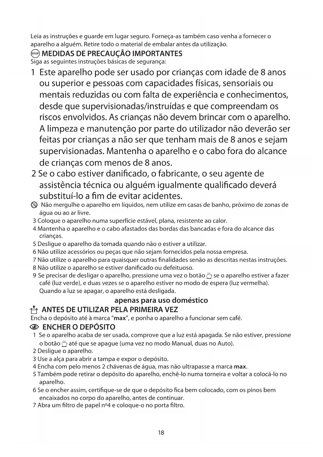 U ANTES DE UTILIZAR PELA PRIMEIRA VEZ Encha o depósito até à marca “max”, e ponha o aparelho a funcionar sem café.