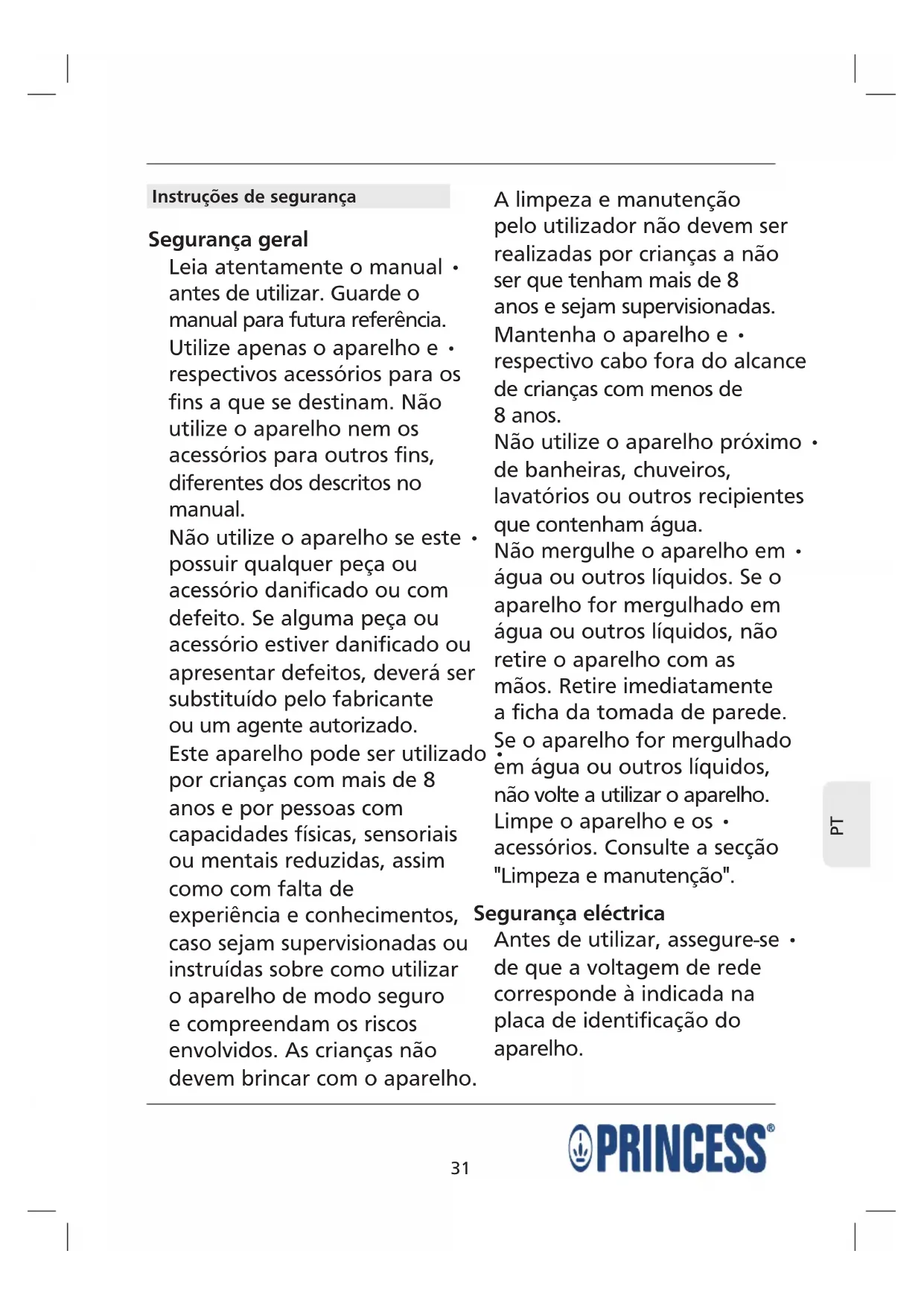Instruções de segurança Segurança geral Leia atentamente o manual • antes de utilizar. Guarde o manual para futura referência. Utilize apenas o aparelho e • respectivos acessórios para os fins a que se destinam. Não utilize o aparelho nem os acessórios para outros fins, diferentes dos descritos no manual. Não utilize o aparelho se este • possuir qualquer peça ou acessório danificado ou com defeito. Se alguma peça ou acessório estiver danificado ou apresentar defeitos, deverá ser substituído pelo fabricante ou um agente autorizado. Este aparelho pode ser utilizado • por crianças com mais de 8 anos e por pessoas com capacidades físicas, sensoriais ou mentais reduzidas, assim como com falta de experiência e conhecimentos, caso sejam supervisionadas ou instruídas sobre como utilizar o aparelho de modo seguro e compreendam os riscos envolvidos. As crianças não devem brincar com o aparelho. A limpeza e manutenção pelo utilizador não devem ser realizadas por crianças a não ser que tenham mais de 8 anos e sejam supervisionadas. Mantenha o aparelho e • respectivo cabo fora do alcance de crianças com menos de 8 anos. Não utilize o aparelho próximo • de banheiras, chuveiros, lavatórios ou outros recipientes que contenham água. Não mergulhe o aparelho em • água ou outros líquidos. Se o aparelho for mergulhado em água ou outros líquidos, não retire o aparelho com as mãos. Retire imediatamente a ficha da tomada de parede. Se o aparelho for mergulhado em água ou outros líquidos, não volte a utilizar o aparelho. Limpe o aparelho e os • acessórios. Consulte a secção "Limpeza e manutenção". Segurança eléctrica Antes de utilizar, assegure-se • de que a voltagem de rede corresponde à indicada na placa de identificação do aparelho.32