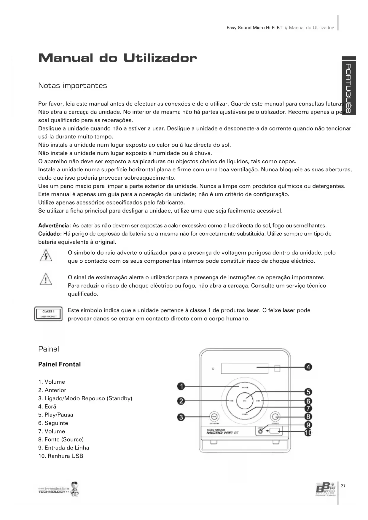 - GERAL: A Best Buy Internacional ou os seus representantes não serão responsáveis, em caso nenhum, pelos danos, incluindo os derivados de perdas de lucros ou qualquer outra perda pecuniária, que sejam originados em consequência do uso ou da im- possibilidade de uso do produto em questão, partindo inclusive do princípio de que a Best Buy International tenha informado que possam ser originados. Como beneficiar da condição de utilizador registado? Registe-se na nossa página da Internet http://www.bestbuy-int.com Como solicitar assistência técnica? Uma vez registado, pode solicitar assistência técnica sempre que o desejar, da forma seguinte: PORTUGUÊS Manual do Utilizador // Easy Sound Micro Hi-Fi BT
