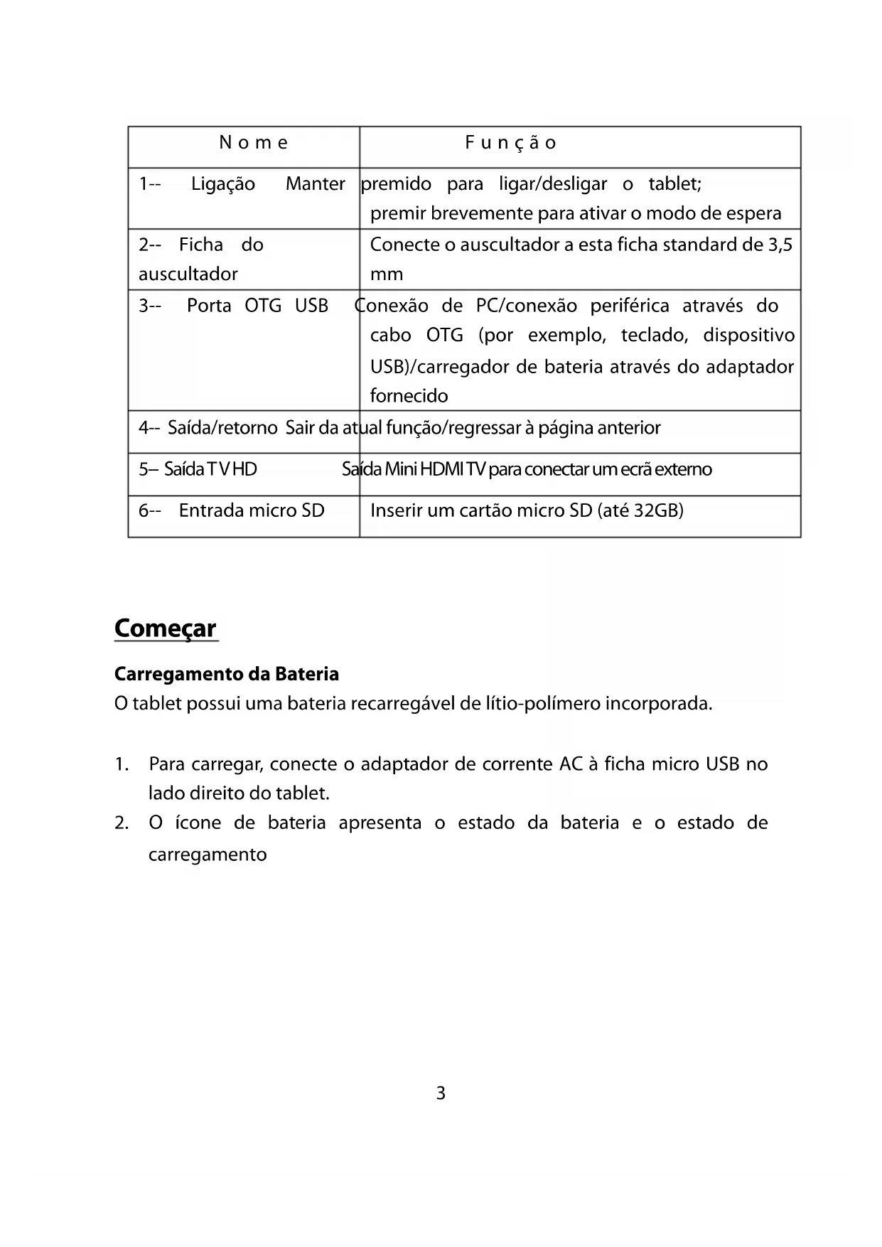 | 3-- Porta OTG USB | Conexão de PC/conexão periférica atraves do cabo OTG (por exemplo, teclado, dispositivo USB)/carregador de bateria atraves do adaptorforcedico |