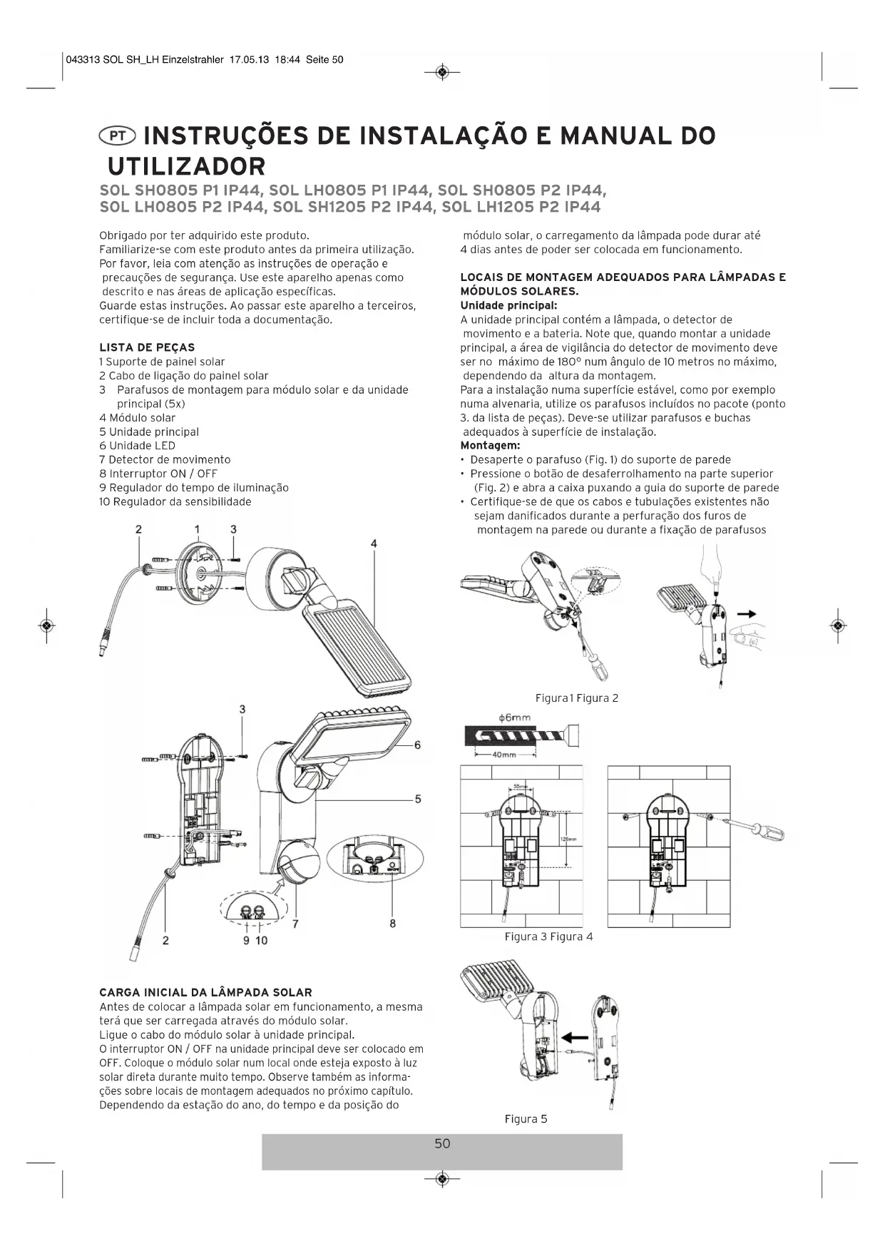 OL SH0805 P1 IP44, SOL LH0805 P1 IP44, SOL SH0805 P2 IP44, SOL LH0805 P2 IP44, SOL SH1205 P2 IP44, SOL LH1205 P2 IP44 043313 SOL SH_LH Einzelstrahler 17.05.13 18:44 Seite 5051 Figura 6 Figura 7 Módulo solar: O módulo solar é a principal fonte de energia da lâmpada solar. Ele converte a luz solar em eletricidade e carrega a bateria. Note que, durante a montagem do módulo solar, a célula solar precisa da LUZ DIRETA DO SOL. Quanto mais tempo a célula solar estiver exposta à luz solar direta, mais tempo a lâmpada poderá ficar em funcionamento. O módulo solar deve ser instalado virado para sul, de modo a captar a luz solar direta. Evite qualquer tipo de sombra. Na Europa central recomenda-se um ângulo de inclinação de cerca de 30° a 40°. Aplique os parafusos incluídos no pacote (ponto 3. na lista de peças), para instalar o módulo solar numa superfície sólida, como por exemplo numa alvenaria. Deve-se utilizar parafusos e buchas adequados à superfície de instalação. Figura