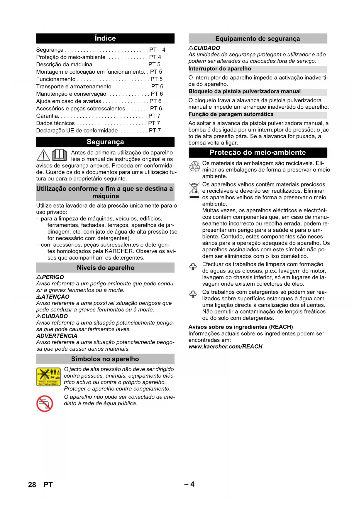 93 dB(A) Sujeto a modificaciones técnicas. Declaración UE de conformidad Producto: Limpiadora a alta presión Modelo: 1.673-xxx Directivas comunitarias aplicables 2011/65/UE 2000/14/CE 2006/42/CE (+2009/127/CE) 2014/30/UE Normas armonizadas aplicadas EN 60335–1 EN 60335–2–79 EN 62233: 2008 EN 55014–1:2017 EN 55014–2: 2015 EN 61000–3–2: 2014 EN 61000–3–3: 2013 EN IEC 63000: 2018 Procedimiento de evaluación de la conformidad aplicado 2000/14/CE: Anexo V Nivel de potencia acústica dB(A) Medido: 90 Garantizado: 93 Chairman of the Board of Management Director Regulatory Affairs & Certification 27ES– 4 Antes da primeira utilização do aparelho leia o manual de instruções original e os avisos de segurança anexos. Proceda em conformida- de. Guarde os dois documentos para uma utilização fu- tura ou para o proprietário seguinte. Utilize esta lavadora de alta pressão unicamente para o uso privado: – para a limpeza de máquinas, veículos, edifícios, ferramentas, fachadas, terraços, aparelhos de jar- dinagem, etc. com jato de água de alta pressão (se for necessário com detergentes). – com acessórios, peças sobressalentes e detergen- tes homologados pela KÄRCHER. Observe os avi- sos que acompanham os detergentes. PERIGO Aviso referente a um perigo eminente que pode condu- zir a graves ferimentos ou à morte. 몇 ATENÇÃO Aviso referente a uma possível situação perigosa que pode conduzir a graves ferimentos ou à morte. 몇 CUIDADO Aviso referente a uma situação potencialmente perigo- sa que pode causar ferimentos leves. ADVERTÊNCIA Aviso referente a uma situação potencialmente perigo- sa que pode causar danos materiais. 몇 CUIDADO As unidades de segurança protegem o utilizador e não podem ser alteradas ou colocadas fora de serviço. O interruptor do aparelho impede a activação inadverti- da do aparelho. O bloqueio trava a alavanca da pistola pulverizadora manual e impede um arranque inadvertido do aparelho. Ao soltar a alavanca da pistola pulverizadora manual, a bomba é desligada por um interruptor de pressão; o jac- to de alta pressão pára. Se a alavanca for puxada, a bomba volta a ligar. Avisos sobre os ingredientes (REACH) Informações actuais sobre os ingredientes podem ser encontradas em: www.kaercher.com/REACH Índice Segurança . . . . . . . . . . . . . . . . . . . . . . . . . . . PT4 Proteção do meio-ambiente . . . . . . . . . . . . . PT 4 Descrição da máquina. . . . . . . . . . . . . . . . . . PT 5 Montagem e colocação em funcionamento. . PT 5 Funcionamento . . . . . . . . . . . . . . . . . . . . . . . PT 5 Transporte e armazenamento . . . . . . . . . . . . PT 6 Manutenção e conservação . . . . . . . . . . . . . PT 6 Ajuda em caso de avarias . . . . . . . . . . . . . . . PT 6 Acessórios e peças sobressalentes . . . . . . . PT 6 Garantia. . . . . . . . . . . . . . . . . . . . . . . . . . . . . PT 7 Dados técnicos . . . . . . . . . . . . . . . . . . . . . . . PT 7 Declaração UE de conformidade . . . . . . . . . PT 7 Segurança Utilização conforme o fim a que se destina a máquina Níveis do aparelho Símbolos no aparelho O jacto de alta pressão não deve ser dirigido contra pessoas, animais, equipamento eléc- trico activo ou contra o próprio aparelho. Proteger o aparelho contra congelamento. O aparelho não pode ser conectado de ime- diato à rede de água pública. Equipamento de segurança Interruptor do aparelho Bloqueio da pistola pulverizadora manual Função de paragem automática Proteção do meio-ambiente Os materiais da embalagem são recicláveis. Eli- minar as embalagens de forma a preservar o meio ambiente. Os aparelhos velhos contêm materiais preciosos e recicláveis e deverão ser reutilizados. Eliminar os aparelhos velhos de forma a preservar o meio ambiente. Muitas vezes, os aparelhos eléctricos e electróni- cos contém componentes que, em caso de manu- seamento incorrecto ou recolha errada, podem re- presentar um perigo para a saúde e para o am- biente. Contudo, estes componentes são neces- sários para a operação adequada do aparelho. Os aparelhos assinalados com este símbolo não po- dem ser eliminados com o lixo doméstico. Efectuar os trabalhos de limpeza com formação de águas sujas oleosas, p.ex. lavagem do motor, lavagem do chassis inferior, só em lugares de la- vagem onde existem colectores de óleo. Os trabalhos com detergentes só podem ser rea- lizados sobre superfícies estanques à água com uma ligação directa à canalização dos efluentes. Não permitir a contaminação de lençóis freáticos ou do solo com detergentes. 28 PT– 5 O volume de fornecimento do aparelho (conforme o modelo) é ilustrado na embalagem. Este manual de ins- truções descreve todas as opções possíveis. Ver figuras no lado do gráfico 1 Ligação de alta pressão 2 Interruptor do aparelho "0/OFF" / "I/ON" 3 Local de armazenamento para mangueira de alta pressão 4 Punho de transporte 5 Local de armazenamento para lança 6 Conexão de água com peneira incorporada 7 Peça de acoplamento para ligação da água 8 Cabo de ligação à rede com ficha de rede 9 Placa de tipo 10 Pistola pulverizadora manual 11 Bloqueio da pistola pulverizadora manual 12 Mangueira de alta pressão 13 Grampo para mangueira de alta pressão 14 Tubo de jacto com bocal alta pressão Para trabalhos de limpeza normais. 15 Tubo de jacto com fresadora de sujidade Para sujidade persistente Ver figuras no lado do gráfico Figura Montar os componentes soltos na embalagem no aparelho, antes de proceder à colocação em fun- cionamento. Colocar o aparelho sobre uma superfície plana. Figura Retirar o grampo da pistola pulverizadora manual e colocar a mangueira de alta pressão na pistola pulverizadora manual. Pressionar o grampo até encaixar. Controlar a liga- ção segura, puxando pela mangueira de alta pres- são. Figura ADVERTÊNCIA Contaminações na água podem danificar a bomba de alta pressão e os acessórios. Com