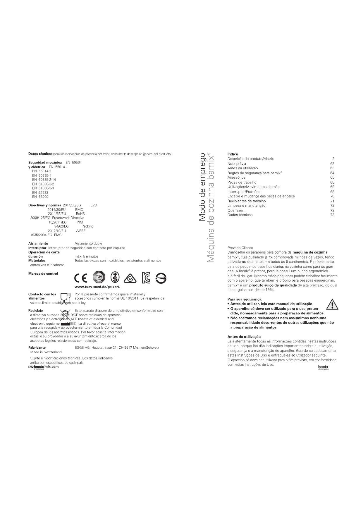 em água de lavar quente e ligar brevemente. Seguidamente, retirar a ficha da tomada e, se necessário, empurrar a peça para baixo, p. ex. com uma chave de parafusos. Por motivos de segurança, retirar a ficha da tomada antes de substituir peças. Nunca tocar em peças em rotação. Entalhe Pino de arrasto Encaixar e retirar na vertical Fixar72 73 Dados técnicos (para indicações sobre a potência consulte a informação geral do produto) Segurança mecânica EN 50564 e eléctrica EN 55014-1 EN 55014-2 EN 60335-1 EN 60335-2-14 EN 61000-3-2 EN 61000-3-3 EN 62233 EN 63000 Directivas e Normas 2014/35/EG LVD 2014/30/EU EMC 2011/65/EU RoHS 2009/125/EG Freamwork Directive 10/2011/EG PIM 94/62/EG Packing 2012/19/EU WEEE 1935/2004 EG FMC Isolamento Isolamento duplo Interruptor Interruptor de segurança com contacto de impulso Funcionamento breve Máx. 5 minutos Materiais Todas as peças são inoxidáveis, resistentes a alimentos e de sabor neutro. Símbolos de teste www.tuev-sued.de/ps-zert. Contacto com Confirmamos que o material e os acessórios correspondem à alimentos Norma 10/2011 e que os valores limites são respeitados. Eliminação Este aparelho está identificado em conformidade com a Directiva europeia 2012/19/UE sobre resíduos de aparelhos elétricos e eletrónicos (WEEE). A Directiva define o quadro para a devolução e reciclagem dos aparelhos usados, válido para a UE. Instruções actualizadas para a eliminação são fornecidas pelos estabelecimentos comerciais especializados ou pela Junta de Freguesia. Fabricante ESGE AG, Hauptstrasse 21, CH-9517 Mettlen/Schweiz Made in Switzerland Reservado o direito de alterações. As indicações acima são específicas do país. www.bamix.com Limpeza e manutenção (Retirar sempre a ficha da tomada elétrica) A limpeza é muito fácil e simples. Retirar a peça de trabalho e lavar. Basta passar a parte suja do aparelho por água corrente após cada utilização, mas sem ligar o interruptor. No caso de resíduos aderen- tes, ligar a bamix