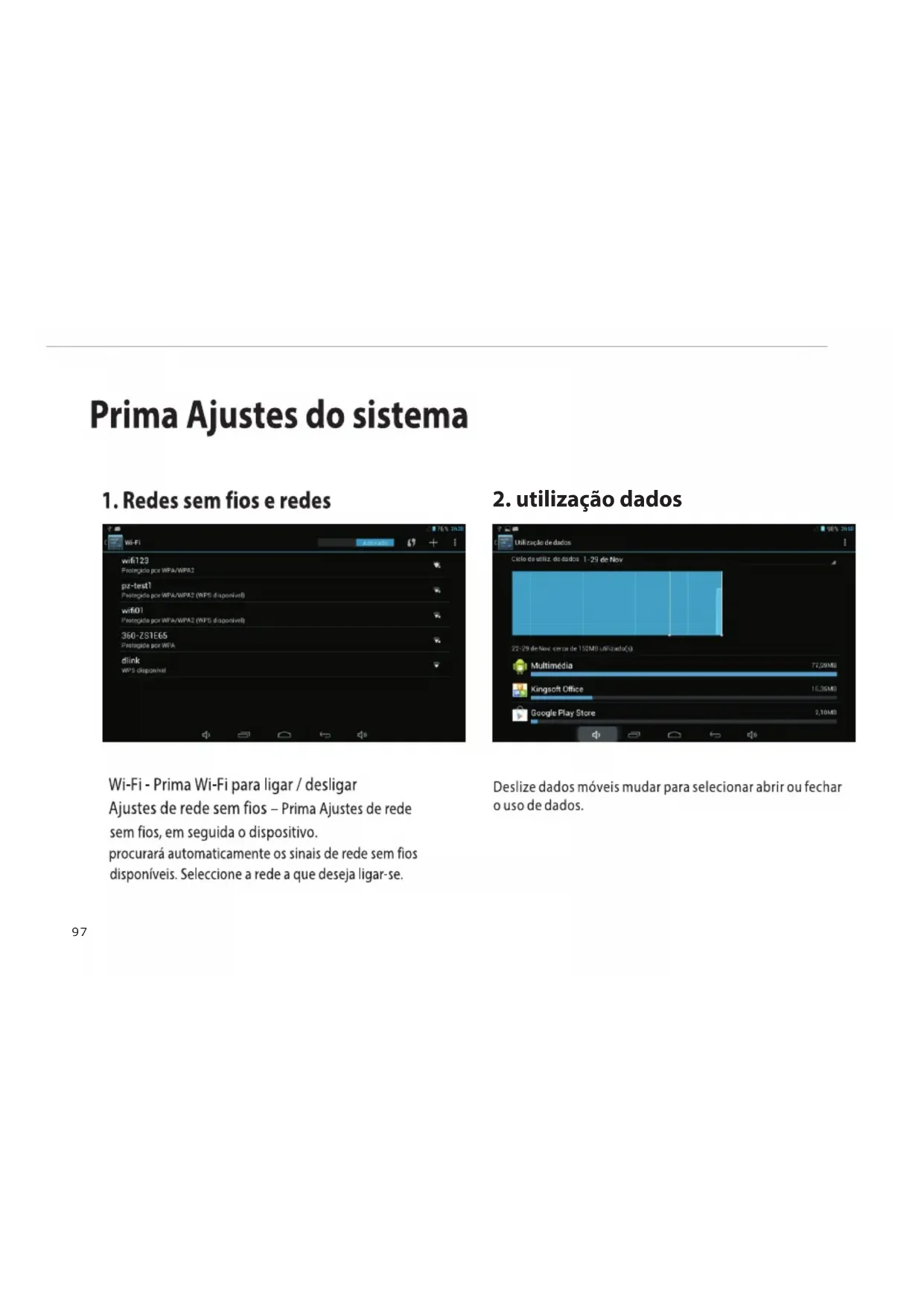 Wi-Fi - Prima Wi-Fi para ligar / desligar Ajustes de rede sem fios – Prima Ajustes de rede sem fios, em seguida o dispositivo. procurará automaticamente os sinais de rede sem fios disponíveis. Seleccione a rede a que deseja ligar-se.
