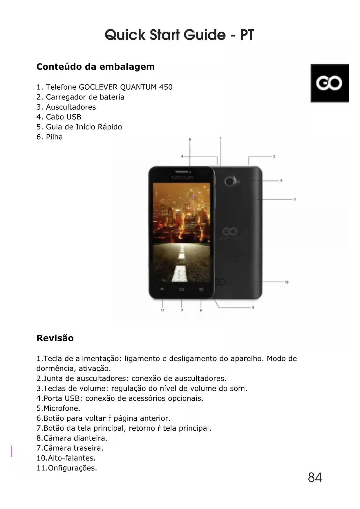Quick Start Guide - PT 84Desmontagem da tampa traseira e remoçăo da pilha Desmontagem da tampa traseira: segure rmemente o lado do aparelho com uma măo e levante a tampa traseira com a outra măo na trava. Remoçăo da pilha: segure rmemente os lados do aparelho com uma măo e retire a pilha com a outra măo, levantando-a na parte inferior. Inserçăo de um cartăo SIM e microSD™ a. Inserçăo do cartăo SIM Ranhura direita é slot para cartão GSM e ranhura esquerda é destinada para o cartão 3G WCDMA, compatível com o padrão 2G. Para inserir o cartão, meta-o suavemente na ranhura correta. Certique-se de que a área con contato dourado do cartão SIM está virada para baixo. Para remover o cartăo, puxe-o suavemente para fora da ranhura. b. Inserçăo do cartăo microSD™ Para inserir o cartăo, meta-o suavemente na ranhura correta. Certique- se de que a área con contato dourado do cartăo microSD™ está virada para baixo. Para remover o cartăo, puxe-o suavemente para fora da ranhura. Carregamento Meta uma extremidade do cabo USB na porta USB do dispositivo e, em seguida, insira o carregador de bateria em uma tomada elétrica. Uma carga completa da pilha leva cerca de 3,5 horas. O uso do dispositivo durante o carregamento pode prolongar o tempo de carga. Quick Start Guide - PT 85Quick Start Guide - PT Atenção: Se o telefone não é usado por muito tempo, a pilha gradualmente descarrega-se. Carregue a pilha antes da primeira utilizaçăo ou mesmo quando o telefone năo estiver em uso, carregue a pilha a cada tręs meses. Ligamento / desligamento do aparelho / modo de dormęncia Pressione e segure o botăo de alimentaçăo durante alguns segundos. A tela de boas-vindas aparece, depois a tela principal. Depois de pressionar uma vez o botăo, o aparelho entra em modo de dormęncia. Para sair deste modo, pressione novamente o botăo de alimentaçăo. Para desligar o aparelho, pressione e segure o botăo de alimentaçăo e em seguida selecione do menu a opçăo Power o. CERTIFICADO DE CONFORMIDADE - PAÍSES DA UE Pela presente GOCLEVER Sp. z o.o. declara que o aparelho GOCLEVER QUANTUM 450 está conforme aos requisitos essenciais e outras disposiçőes relevantes das directivas enumeradas abaixo: