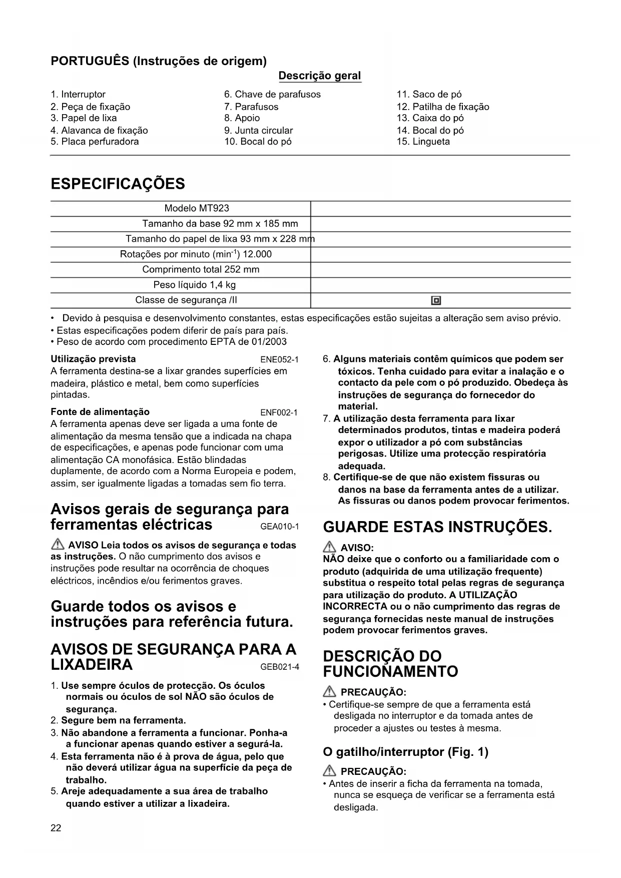 - Peso de acordo com procedimento EPTA de 01/2003 Utilização prevista ENE052-1 A ferramenta destina-se a lixar grandes superfícies em madeira, plástico e metal, bem como superfícies pintadas. Fonte de alimentação ENF002-1 A ferramenta apenas deve ser ligada a uma fonte de alimentação da mesma tensão que a indicada na chapa de especificações, e apenas pode funcionar com uma alimentação CA monofásica. Estão blindadas duplamente, de acordo com a Norma Europeia e podem, assim, ser igualmente ligadas a tomadas sem fio terra. Avisos gerais de segurança para ferramentas eléctricas GEA010-1 AVISO Leia todos os avisos de segurança e todas as instruções. O não cumprimento dos avisos e instruções pode resultar na ocorrência de choques eléctricos, incêndios e/ou ferimentos graves. Guarde todos os avisos e instruções para referência futura.