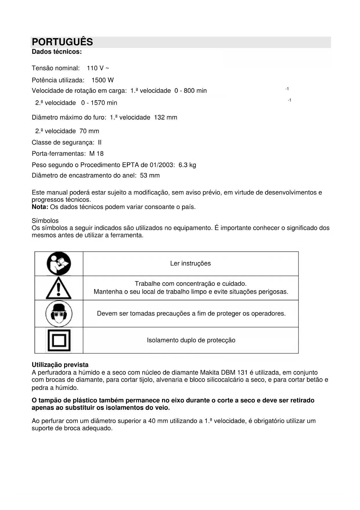 Makita, Jan-Baptist Vinkstraat 2, 3070 BelgiumPORTUGUÊS Dados técnicos: