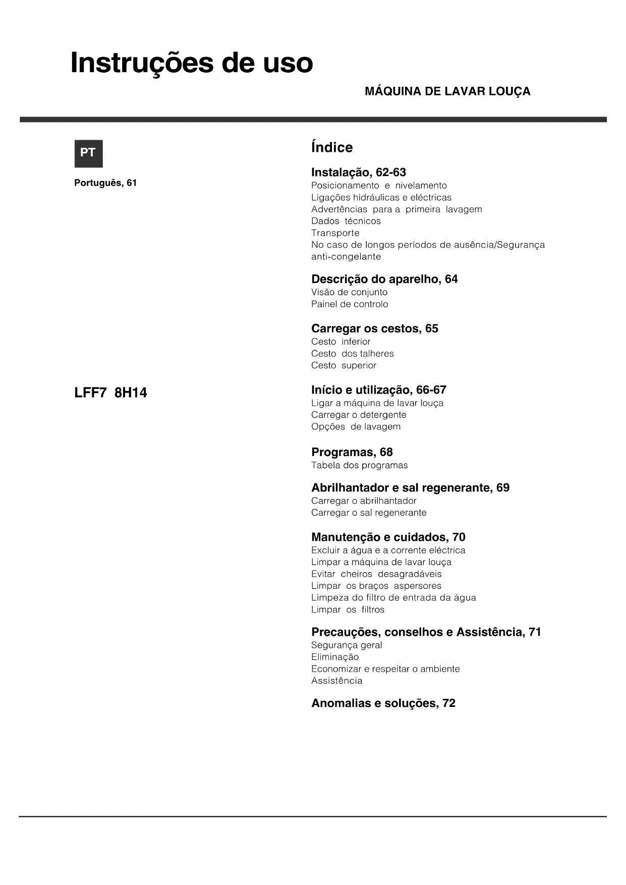 - Presente sólo en algunos modelos.Instruções de uso Índice Instalação, 62-63 Posicionamento e nivelamento Ligações hidráulicas e eléctricas Advertências para a primeira lavagem Dados técnicos Transporte No caso de longos períodos de ausência/Segurança anti-congelante Descrição do aparelho, 64 Visão de conjunto Painel de controlo Carregar os cestos, 65 Cesto inferior Cesto dos talheres Cesto superior Início e utilização, 66-67 Ligar a máquina de lavar louça Carregar o detergente Opções de lavagem Programas, 68 Tabela dos programas Abrilhantador e sal regenerante, 69 Carregar o abrilhantador Carregar o sal regenerante Manutenção e cuidados, 70 Excluir a água e a corrente eléctrica Limpar a máquina de lavar louça Evitar cheiros desagradáveis Limpar os braços aspersores Limpeza do filtro de entrada da água Limpar os filtros Precauções, conselhos e Assistência, 71 Segurança geral Eliminação Economizar e respeitar o ambiente Assistência Anomalias e soluções, 72 Português, 61