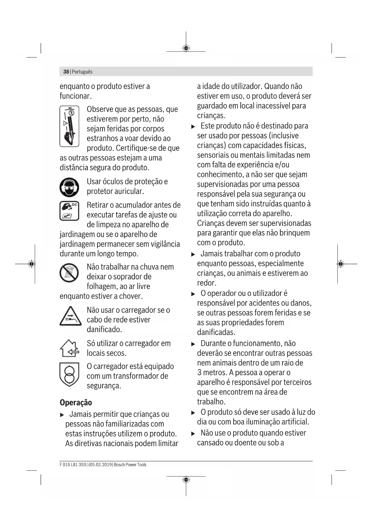 u Atención: Desconecte el aparato para jardín y retire el acumulador antes de realizar trabajos de ajuste y lim- pieza. Mantenimiento, limpieza y almacenaje u Siempre mantenga limpio el producto para trabajar con eficacia y seguridad. Para lograr una operación óptima limpie el ventilador y el área circundante al mismo después de cada uso. Siempre mantenga limpios el producto y las rejillas de venti- lación para poder trabajar con eficacia y fiabilidad. Limpie el producto o el saco recogedor con un paño húme- do. Jamás proyecte agua contra el producto. Nunca sumerja en agua el producto. Guarde el producto en un lugar seguro y seco, fuera del al- cance de los niños. No deposite ningún objeto sobre el producto. Cuidado del acumulador Para asegurar un aprovechamiento óptimo del acumulador tenga en cuenta las siguientes indicaciones y medidas: – Proteja el acumulador de la humedad y del agua. – Únicamente almacene el acumulador a una temperatura situada entre -20 °C y 50 °C. No deje, p. ej., el acumula- dor dentro del coche en el verano. – Guarde el acumulador por separado, sin tenerlo montado en el aparato para jardín. – No deje el acumulador en el aparato para jardín si éste es- tuviese directamente expuesto a sol. – La temperatura ideal para almacenar el acumulador es de 5°C. – Limpie de vez en cuando las rejillas de refrigeración del acumulador con un pincel suave, limpio y seco. Si después de haberlo recargado, el tiempo de funciona- miento del acumulador fuese muy corto, ello es síntoma de que está agotado y debe sustituirse. Servicio técnico y atención al cliente www.bosch-garden.com Para cualquier consulta o pedido de piezas de repuesto es imprescindible indicar el nº de artículo de 10dígitos que fi- gura en la placa de características del producto. España Robert Bosch España S.L.U. Departamento de ventas Herramientas Eléctricas C/Hermanos García Noblejas, 19 28037 Madrid Para efectuar su pedido online de recambios o pedir la reco- gida para la reparación de su máquina, entre en la página www.herramientasbosch.net. Tel. Asesoramiento al cliente: 902 531 553 Fax: 902 531554 Argentina Robert Bosch Argentina S.A. Calle Blanco Encalada 250 – San Isidro Código Postal B1642AMQ Ciudad Autónoma de Buenos Aires Tel.: (54) 11 5296 5200 E-Mail: herramientas.bosch@ar.bosch.com www.argentina.bosch.com.ar Chile Robert Bosch S.A. Calle El Cacique 0258 Providencia – Santiago de Chile Buzón Postal 7750000 Tel.: (56) 02 782 0200 www.bosch.cl Ecuador Robert Bosch Sociedad Anónima Av. Rodrigo Chávez Gonzalez Parque Empresarial Colón Edif. Coloncorp Piso 1 Local 101-102, Guayaquil Tel.: (593) 4 220 4000 E-mail: ventas@bosch.com.ec www.bosch.ec México Robert Bosch S. de R.L. de C.V. Calle Robert Bosch No. 405 C.P. 50071 Zona Industrial, Toluca - Estado de México Tel.: (52) 55 528430-62 Tel.: 800 6271286 www.bosch-herramientas.com.mx Perú Robert Bosch S.A.C. Av. Primavera 781 Piso 2, Urbanización Chacarilla San Borja Lima Tel.: (51) 1 706 1100 www.bosch.com.pe Venezuela Robert Bosch S.A. Calle Vargas con Buen Pastor, Edif. Alba, P-1, Boleita Norte, Caracas 1071 Tel.: (58) 212 207-4511 www.boschherramientas.com.ve F 016 L81 393 | (05.02.2019) Bosch Power ToolsPortuguês | 37 Transporte Los acumuladores de iones de litio incorporados están suje- tos a los requerimientos estipulados en la legislación sobre mercancías peligrosas. Los acumuladores pueden ser trans- portados por carretera por el usuario sin más imposiciones. En el envío por terceros (p.ej., transporte aéreo o por agen- cia de transportes) deberán considerarse las exigencias es- peciales en cuanto a su embalaje e identificación. En este ca- so deberá recurrirse a los servicios de un experto en mercan- cías peligrosas al preparar la pieza para su envío. Únicamente envíe acumuladores si su carcasa no está daña- da. Si los contactos no van protegidos cúbralos con cinta adhesiva y embale el acumulador de manera que éste no se pueda mover dentro del embalaje. Observe también las prescripciones adicionales que pudieran existir al respecto en su país. Eliminación Los aparatos para jardín, acumuladores, acce- sorios y embalajes deberán someterse a un proceso de recuperación que respete el medio ambiente. ¡No arroje los aparatos para jardín, acumulado- res o pilas a la basura! Sólo para los países de laUE: Los aparatos eléctricos y electrónicos inservibles, así como los acumuladores/pilas defectuosos o agotados deberán acumularse por separado para ser sometidos a un reciclaje ecológico tal como lo marcan las Directivas Europeas 2012/19/EU y 2006/66/CE, respectivamente. Acumuladores/pilas: Iones de Litio: Observe las indicaciones comprendidas en el apartado (ver "Transporte", Página37). El símbolo es solamente válido, si también se encuentra sobre la placa de características del producto/fabricado. Português Indicações de segurança Atenção! Leia atentamente as seguintes instruções. Familiarize-se com os elementos de comando e com a utilização do produto. Guarde as instruções de serviço em lugar seguro para uma utilização posterior. Explicação dos símbolos no aparelho de jardinagem Indicação geral de perigos. Leia atentamente estas instruções de serviço. Certifique-se de que as pessoas nas proximidades não podem ser feridas pela projeção de corpos estranhos. Aviso: Mantenha-se a uma distância segura do produto enquanto ele estiver a funcionar. Ventoinha rotativa. As mãos e os pés ou roupas largas não devem se aproximar das aberturas, enquanto o produto estiver a funcionar. As mãos e os pés ou roupas largas não devem se aproximar das aberturas, Bosch Power Tools F 016 L81 393 | (05.02.2019)38 | Português enquanto o produto estiver a funcionar. Observe que as pessoas, que estiverem por perto, não sejam feridas por corpos estranhos a voar devido ao produto. Certifique-se de que as outras pessoas estejam a uma distância segura d