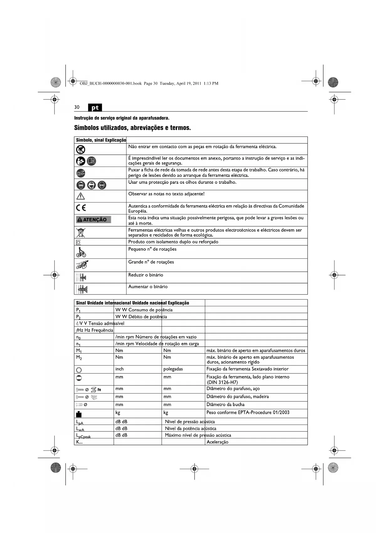 Instrução de serviço original da aparafusadora. Símbolos utilizados, abreviações e termos. Símbolo, sinal Explicação Não entrar em contacto com as peças em rotação da ferramenta eléctrica. É imprescindível ler os documentos em anexo, portanto a instrução de serviço e as indi- cações gerais de segurança. Puxar a ficha de rede da tomada de rede antes desta etapa de trabalho. Caso contrário, há perigo de lesões devido ao arranque da ferramenta eléctrica. Usar uma protecção para os olhos durante o trabalho. Observar as notas no texto adjacente! Autentica a conformidade da ferramenta eléctrica em relação às directivas da Comunidade Européia. Esta nota indica uma situação possivelmente perigosa, que pode levar a graves lesões ou até à morte. Ferramentas eléctricas velhas e outros produtos electrotécnicos e eléctricos devem ser separados e reciclados de forma ecológica. Produto com isolamento duplo ou reforçado Pequeno n° de rotações Grande n° de rotações Reduzir o binário Aumentar o binário Sinal Unidade internacional Unidade nacional Explicação