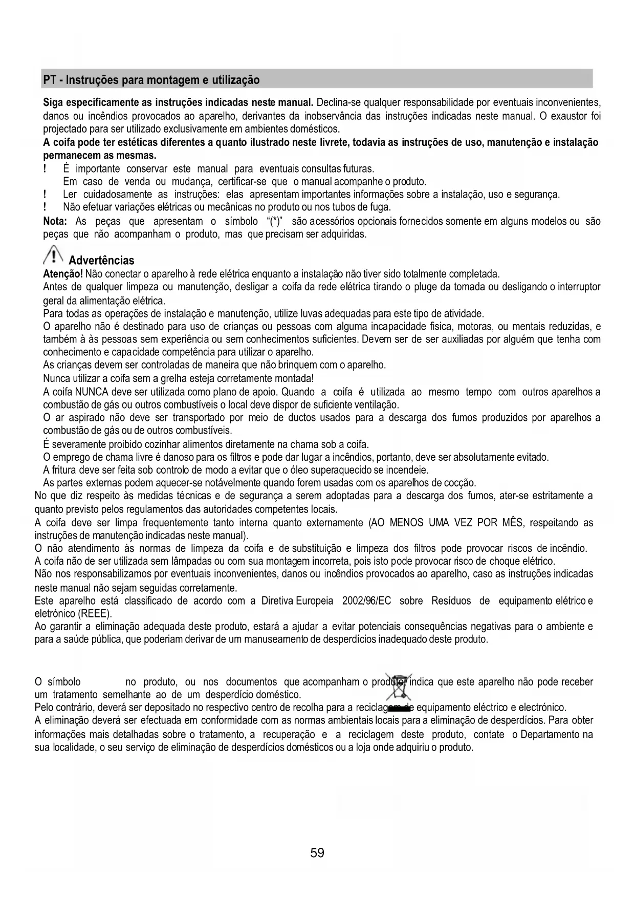 As crianças devem ser controladas de maneira que não brinquem com o aparelho. Nunca utilizar a coifa sem a grelha esteja corretamente montada! A coifa NUNCA deve ser utilizada como plano de apoio. Quando a coifa é utilizada ao mesmo tempo com outros aparelhos a