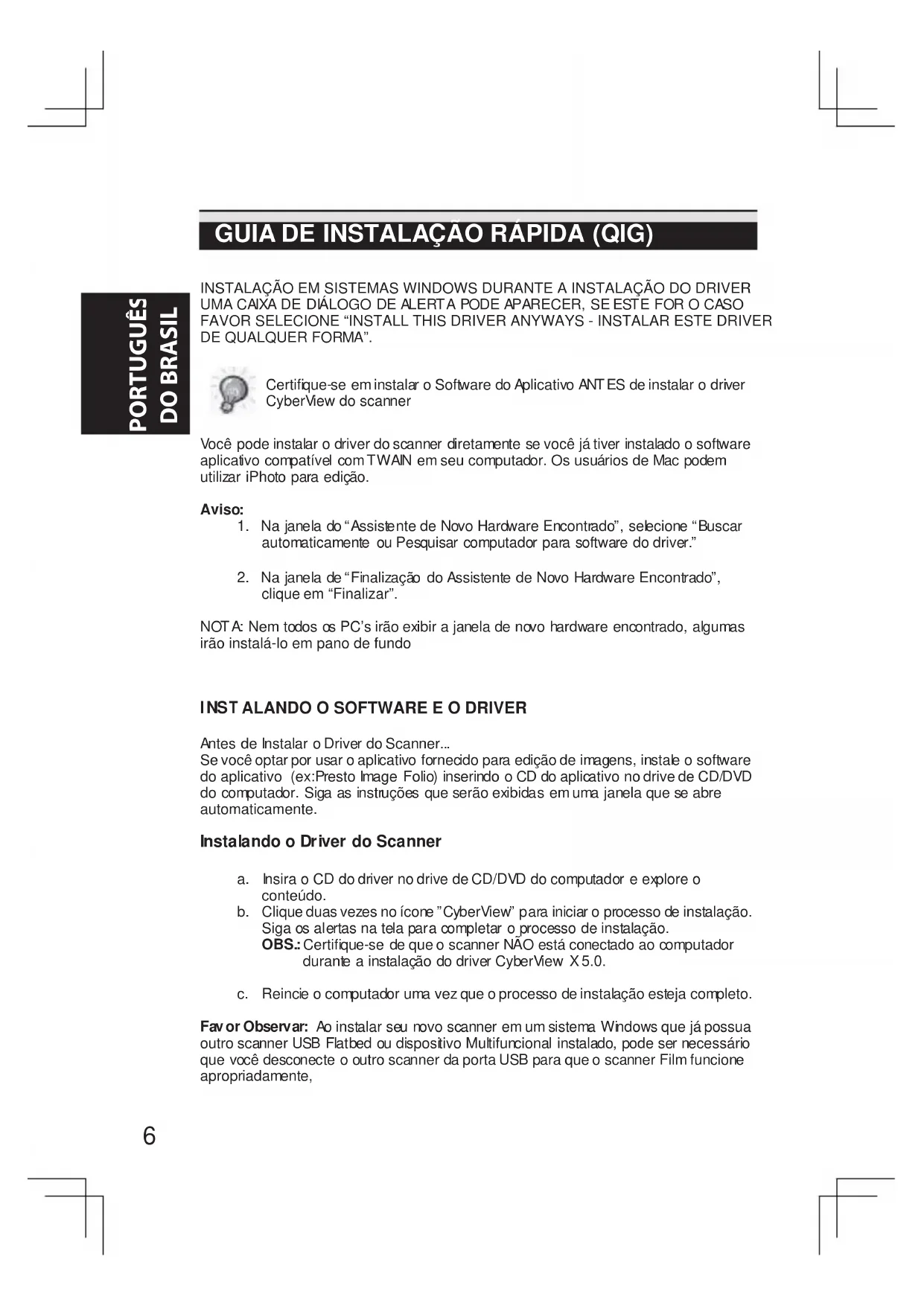 Instalando o Driver do Scanner a. Insira o CD do driver no drive de CD/DVD do computador e explore o conteúdo. b. Clique duas vezes no ícone ”CyberView” para iniciar o processo de instalação. Siga os alertas na tela para completar o processo de instalação. OBS.: Certifique-se de que o scanner NÃO está conectado ao computador durante a instalação do driver CyberView X 5.0.