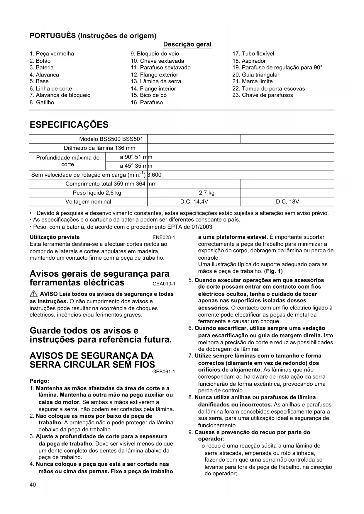 AVISOS DE SEGURANÇA DA SERRA CIRCULAR SEM FIOS GEB061-1