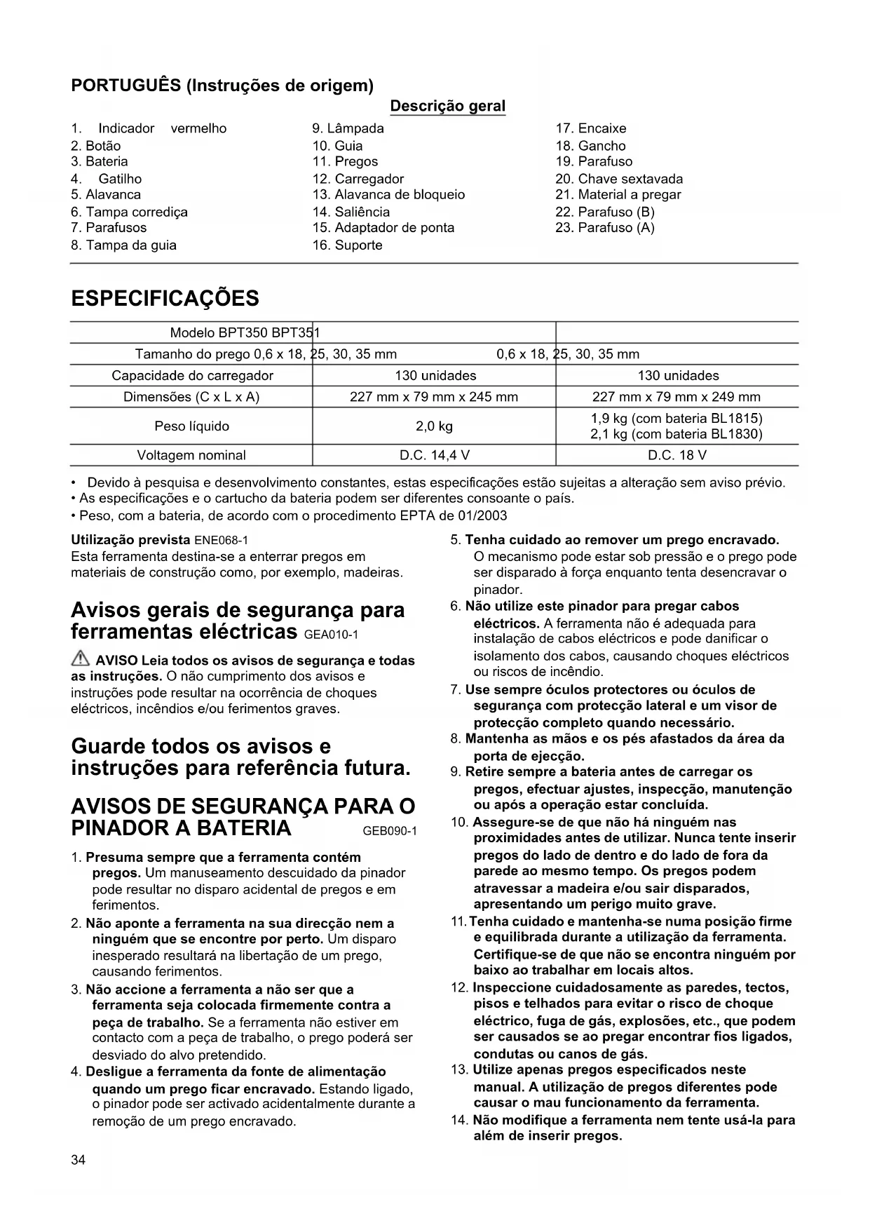 AVISOS DE SEGURANÇA PARA O PINADOR A BATERIA GEB090-1