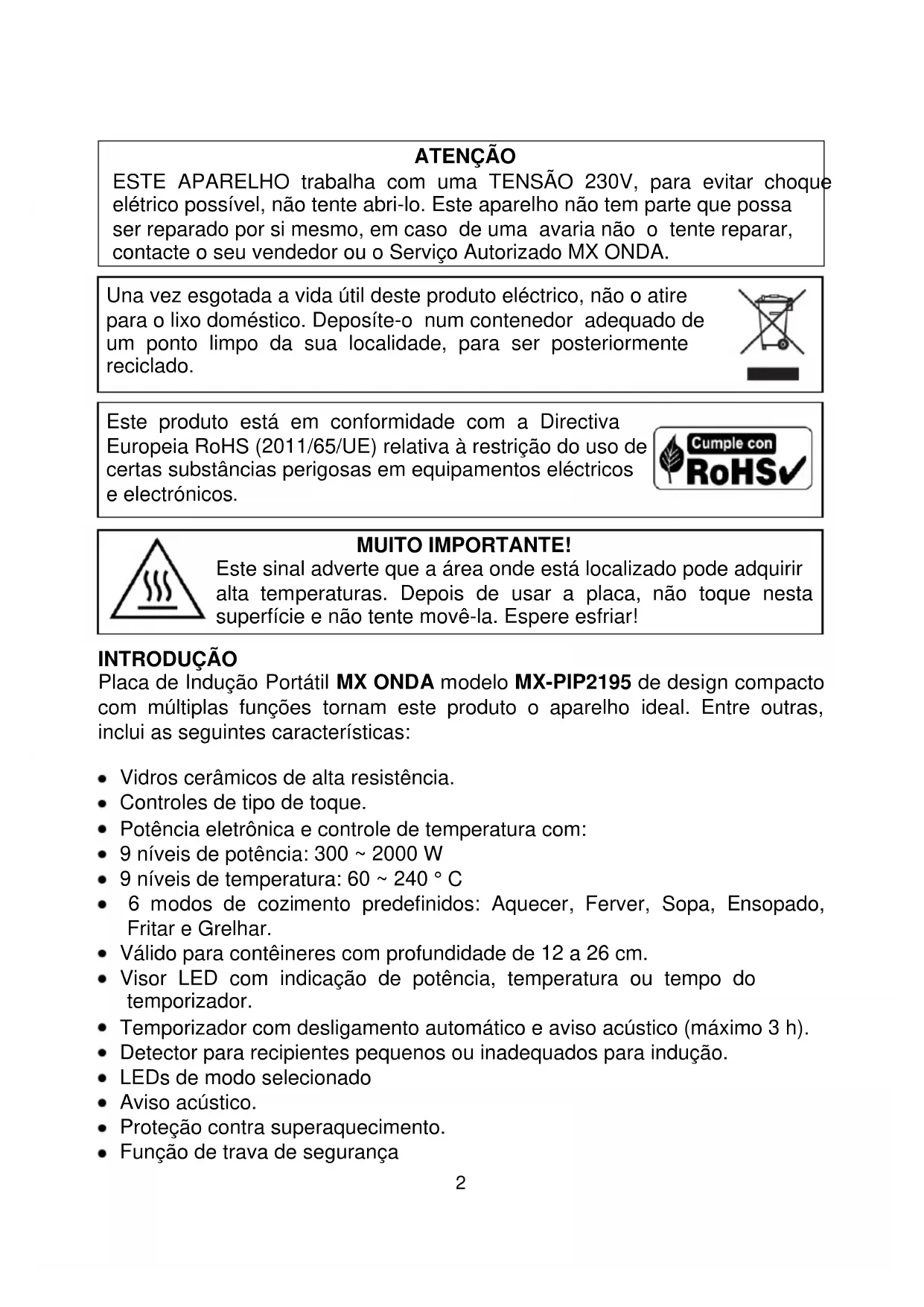 MUITO IMPORTANTE! Este sinal adverte que a área onde está localizado pode adquirir alta temperaturas. Depois de usar a placa, não toque nesta superfície e não tente movê-la. Espere esfriar! INTRODUÇÃO Placa de Indução Portátil MX ONDA modelo MX-PIP2195 de design compacto com múltiplas funções tornam este produto o aparelho ideal. Entre outras, inclui as seguintes características: Vidros cerâmicos de alta resistência. Controles de tipo de toque. Potência eletrônica e controle de temperatura com: 9 níveis de potência: 300 ~ 2000 W 9 níveis de temperatura: 60 ~ 240 ° C 6 modos de cozimento predefinidos: Aquecer, Ferver, Sopa, Ensopado, Fritar e Grelhar. Válido para contêineres com profundidade de 12 a 26 cm. Visor LED com indicação de potência, temperatura ou tempo do temporizador. Temporizador com desligamento automático e aviso acústico (máximo 3 h). Detector para recipientes pequenos ou inadequados para indução. LEDs de modo selecionado Aviso acústico. Proteção contra superaquecimento. Função de trava de segurança Una vez esgotada a vida útil deste produto eléctrico, não o atire para o lixo doméstico. Deposíte-o num contenedor adequado de um ponto limpo da sua localidade, para ser posteriormente reciclado. Este produto está em conformidade com a Directiva Europeia RoHS (2011/65/UE) relativa à restrição do uso de certas substâncias perigosas em equipamentos eléctricos e electrónicos.3