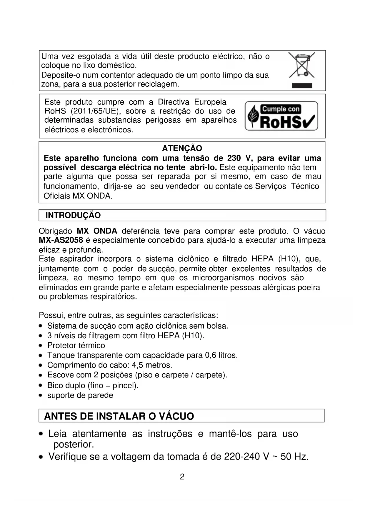 Este produto cumpre com a Directiva Europeia RoHS (2011/65/UE), sobre a restrição do uso de determinadas substancias perigosas em aparelhos eléctricos e electrónicos. ATENÇÃO Este aparelho funciona com uma tensão de 230 V, para evitar uma possível descarga eléctrica no tente abri-lo. Este equipamento não tem parte alguma que possa ser reparada por si mesmo, em caso de mau funcionamento, dirija-se ao seu vendedor ou contate os Serviços Técnico Oficiais MX ONDA.