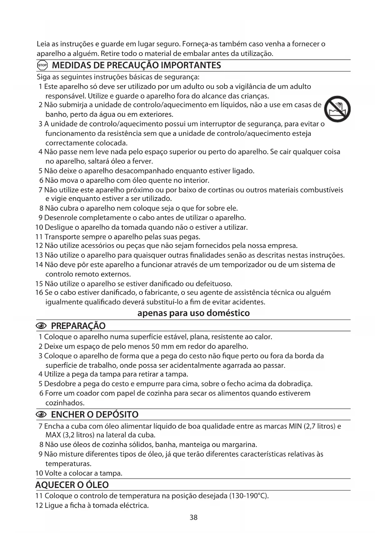 Siga as seguintes instruções básicas de segurança: 1 Este aparelho só deve ser utilizado por um adulto ou sob a vigilância de um adulto responsável. Utilize e guarde o aparelho fora do alcance das crianças. 2 Não submirja a unidade de controlo/aquecimento em líquidos, não a use em casas de banho, perto da água ou em exteriores. 3 A unidade de controlo/aquecimento possui um interruptor de segurança, para evitar o funcionamento da resistência sem que a unidade de controlo/aquecimento esteja correctamente colocada. 4 Não passe nem leve nada pelo espaço superior ou perto do aparelho. Se cair qualquer coisa no aparelho, saltará óleo a ferver. 5 Não deixe o aparelho desacompanhado enquanto estiver ligado. 6 Não mova o aparelho com óleo quente no interior. 7 Não utilize este aparelho próximo ou por baixo de cortinas ou outros materiais combustíveis e vigie enquanto estiver a ser utilizado. 8 Não cubra o aparelho nem coloque seja o que for sobre ele. 9 Desenrole completamente o cabo antes de utilizar o aparelho. 10 Desligue o aparelho da tomada quando não o estiver a utilizar. 11 Transporte sempre o aparelho pelas suas pegas. 12 Não utilize acessórios ou peças que não sejam fornecidos pela nossa empresa. 13 Não utilize o aparelho para quaisquer outras finalidades senão as descritas nestas instruções. 14 Não deve pôr este aparelho a funcionar através de um temporizador ou de um sistema de controlo remoto externos. 15 Não utilize o aparelho se estiver danificado ou defeituoso. 16 Se o cabo estiver danificado, o fabricante, o seu agente de assistência técnica ou alguém igualmente qualificado deverá substituí-lo a fim de evitar acidentes. apenas para uso doméstico
