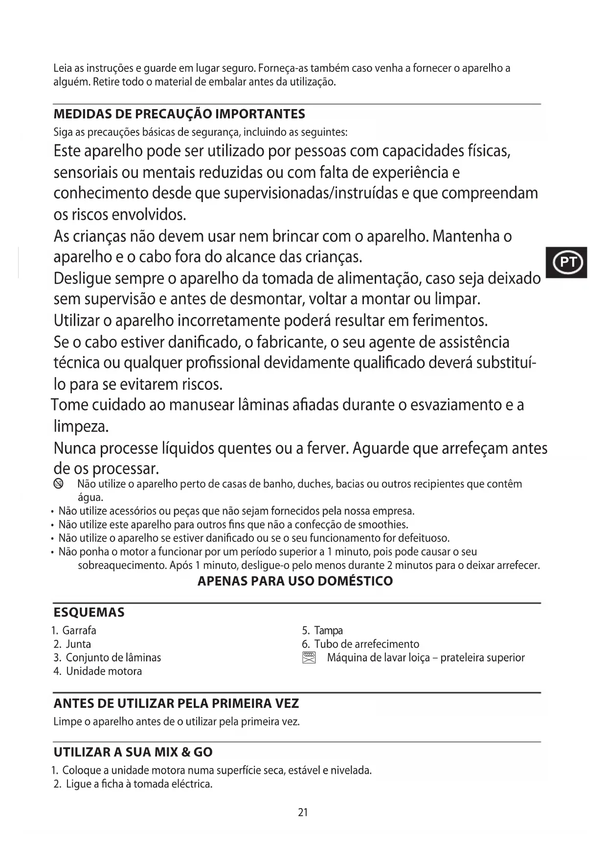 Siga as precauções básicas de segurança, incluindo as seguintes: Este aparelho pode ser utilizado por pessoas com capacidades físicas, sensoriais ou mentais reduzidas ou com falta de experiência e conhecimento desde que supervisionadas/instruídas e que compreendam os riscos envolvidos. As crianças não devem usar nem brincar com o aparelho. Mantenha o aparelho e o cabo fora do alcance das crianças. Desligue sempre o aparelho da tomada de alimentação, caso seja deixado sem supervisão e antes de desmontar, voltar a montar ou limpar. Utilizar o aparelho incorretamente poderá resultar em ferimentos. Se o cabo estiver danificado, o fabricante, o seu agente de assistência técnica ou qualquer profissional devidamente qualificado deverá substituí- lo para se evitarem riscos. Tome cuidado ao manusear lâminas afiadas durante o esvaziamento e a limpeza. Nunca processe líquidos quentes ou a ferver. Aguarde que arrefeçam antes de os processar. b Não utilize o aparelho perto de casas de banho, duches, bacias ou outros recipientes que contêm água.