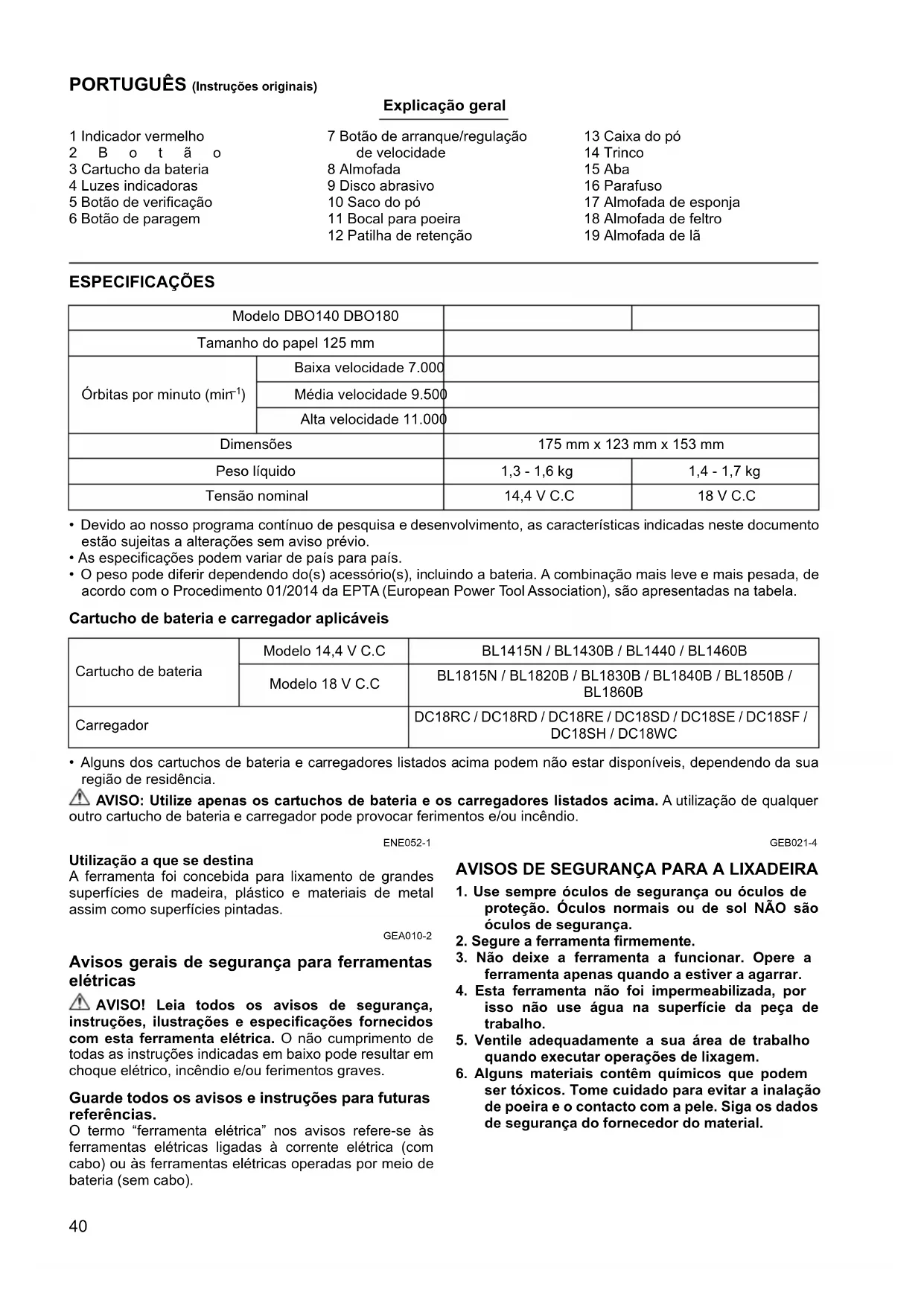 bateria (sem cabo). GEB021-4 AVISOS DE SEGURANÇA PARA A LIXADEIRA