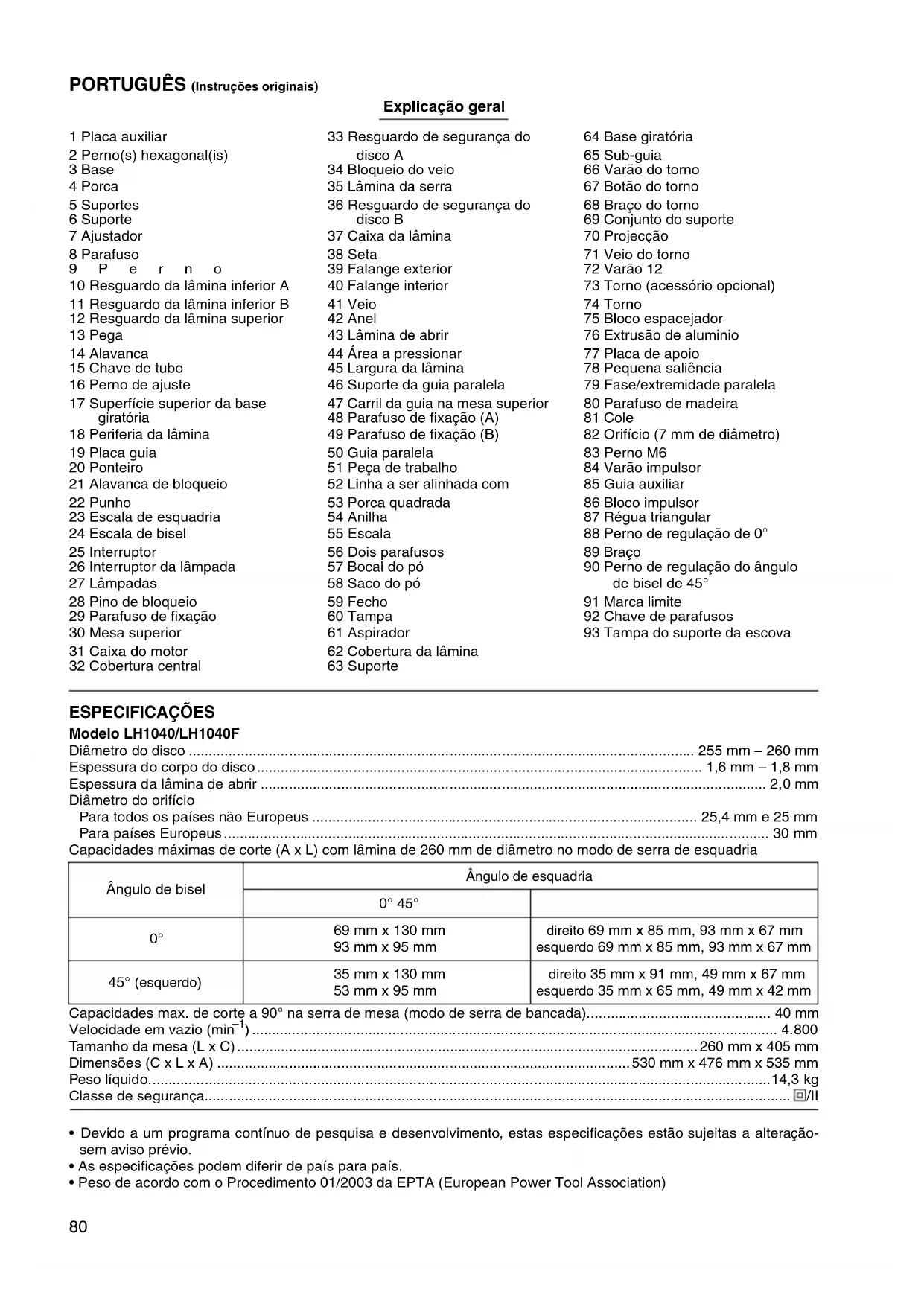 ESPECIFICAÇÕES Modelo LH1040/LH1040F Diâmetro do disco 255 mm – 260 mm