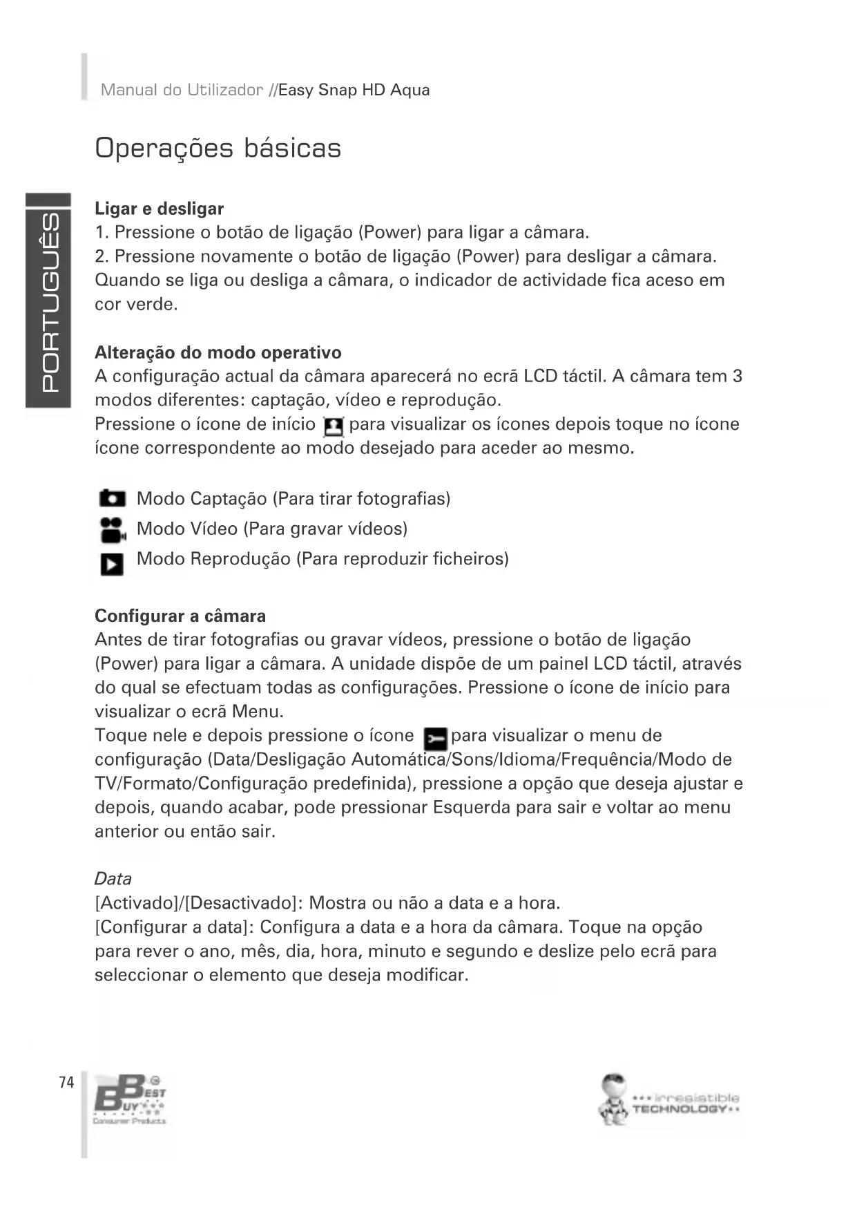 Quando se liga ou desliga a câmara, o indicador de actividade fica aceso em cor verde. Alteração do modo operativo A configuração actual da câmara aparecerá no ecrã LCD táctil. A câmara tem 3 modos diferentes: captação, vídeo e reprodução. ícone correspondente ao modo desejado para aceder ao mesmo. Configurar a câmara Antes de tirar fotografias ou gravar vídeos, pressione o botão de ligação (Power) para ligar a câmara. A unidade dispõe de um painel LCD táctil, através do qual se efectuam todas as configurações. Pressione o ícone de início para visualizar o ecrã Menu. configuração (Data/Desligação Automática/Sons/Idioma/Frequência/Modo de TV/Formato/Configuração predefinida), pressione a opção que deseja ajustar e depois, quando acabar, pode pressionar Esquerda para sair e voltar ao menu anterior ou então sair. Data [Activado]/[Desactivado]: Mostra ou não a data e a hora. [Configurar a data]: Configura a data e a hora da câmara. Toque na opção para rever o ano, mês, dia, hora, minuto e segundo e deslize pelo ecrã para seleccionar o elemento que deseja modificar. PORTUGUÊS Manual do Utilizador // Easy Snap HD Aqua