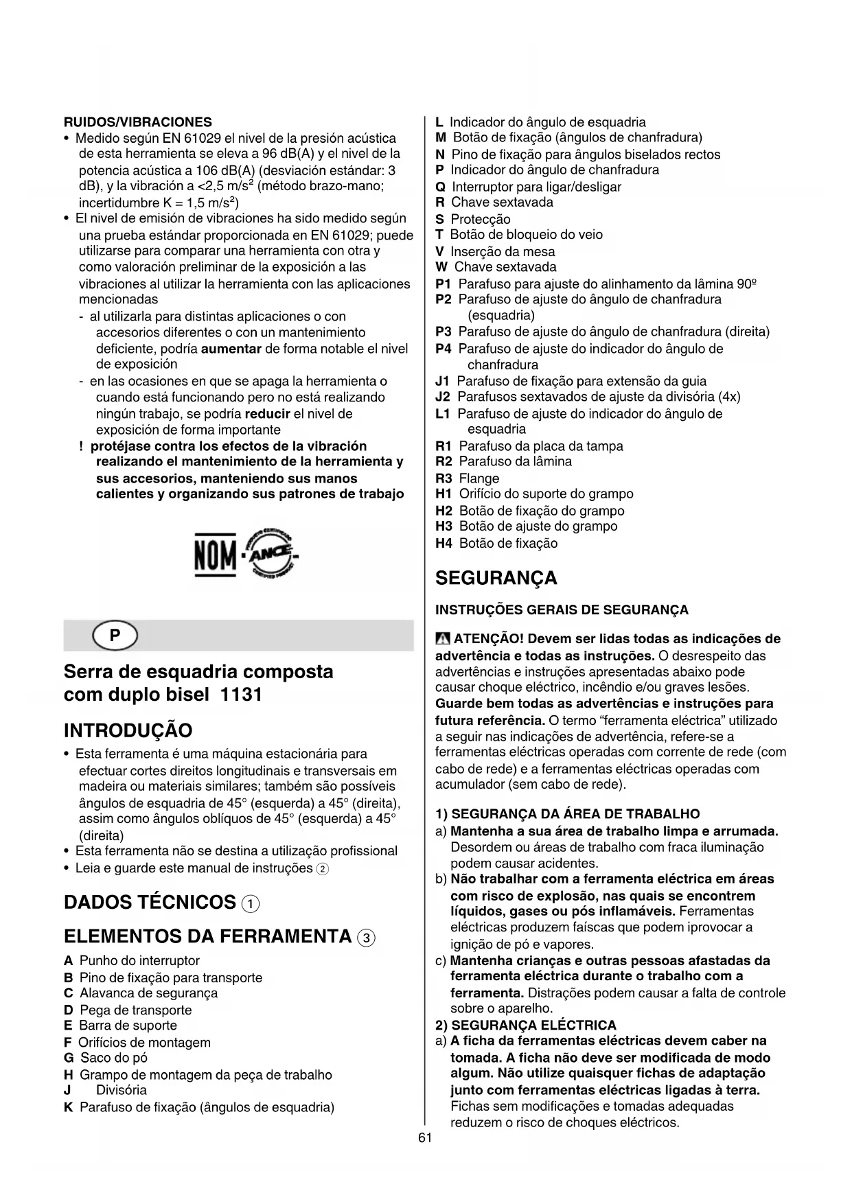 • Medido segundo EN 61029 o nível de pressão acústica