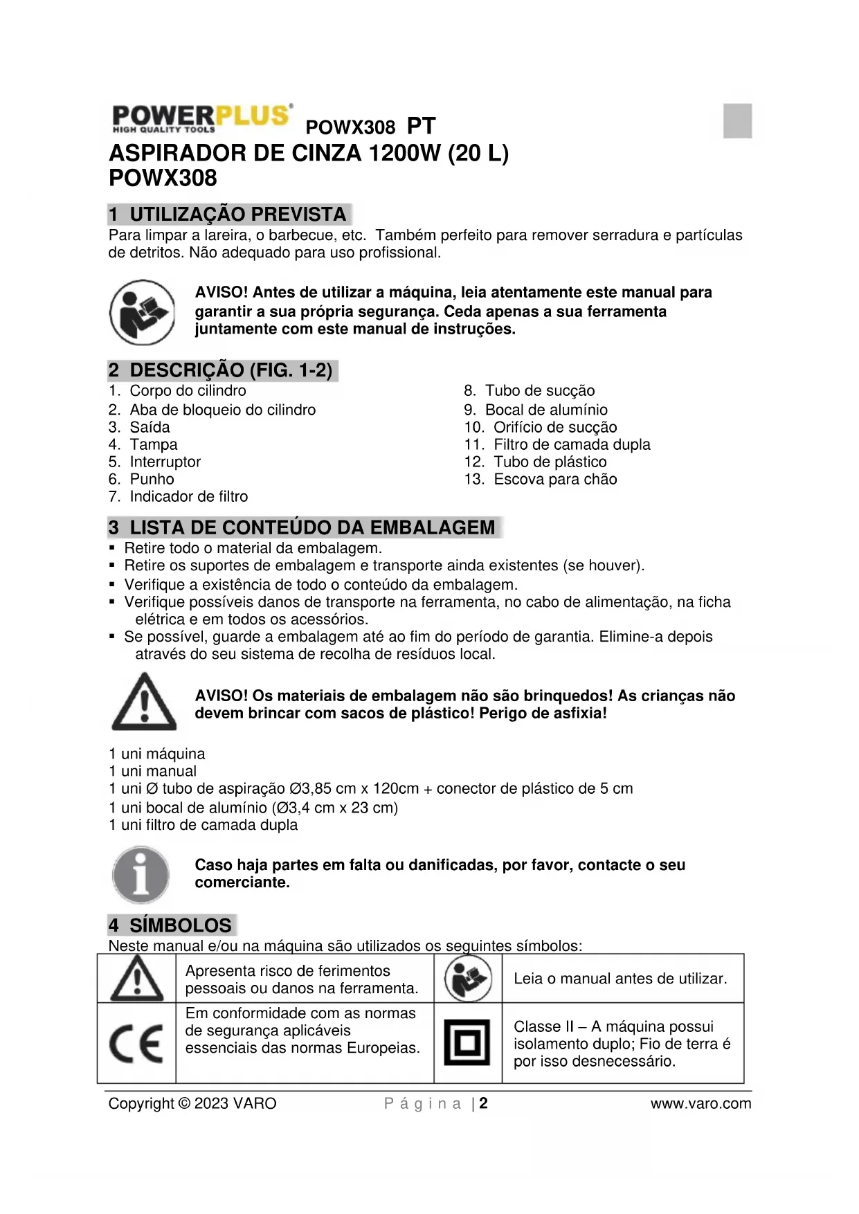 Classe II – A máquina possui isolamento duplo; Fio de terra é por isso desnecessário.POWX308 PT Copyright © 2023 VARO P á g i n a | 3 www.varo.com
